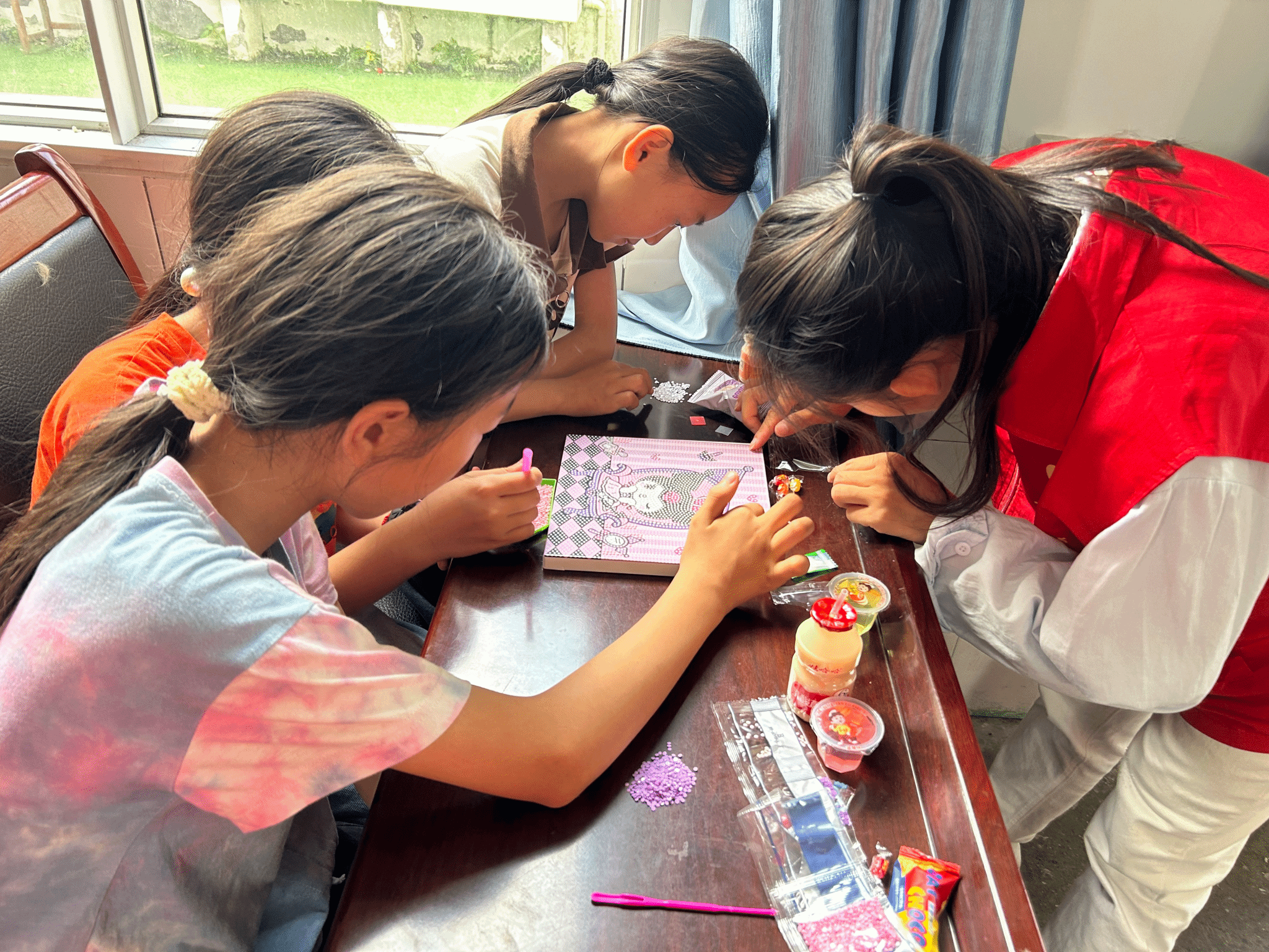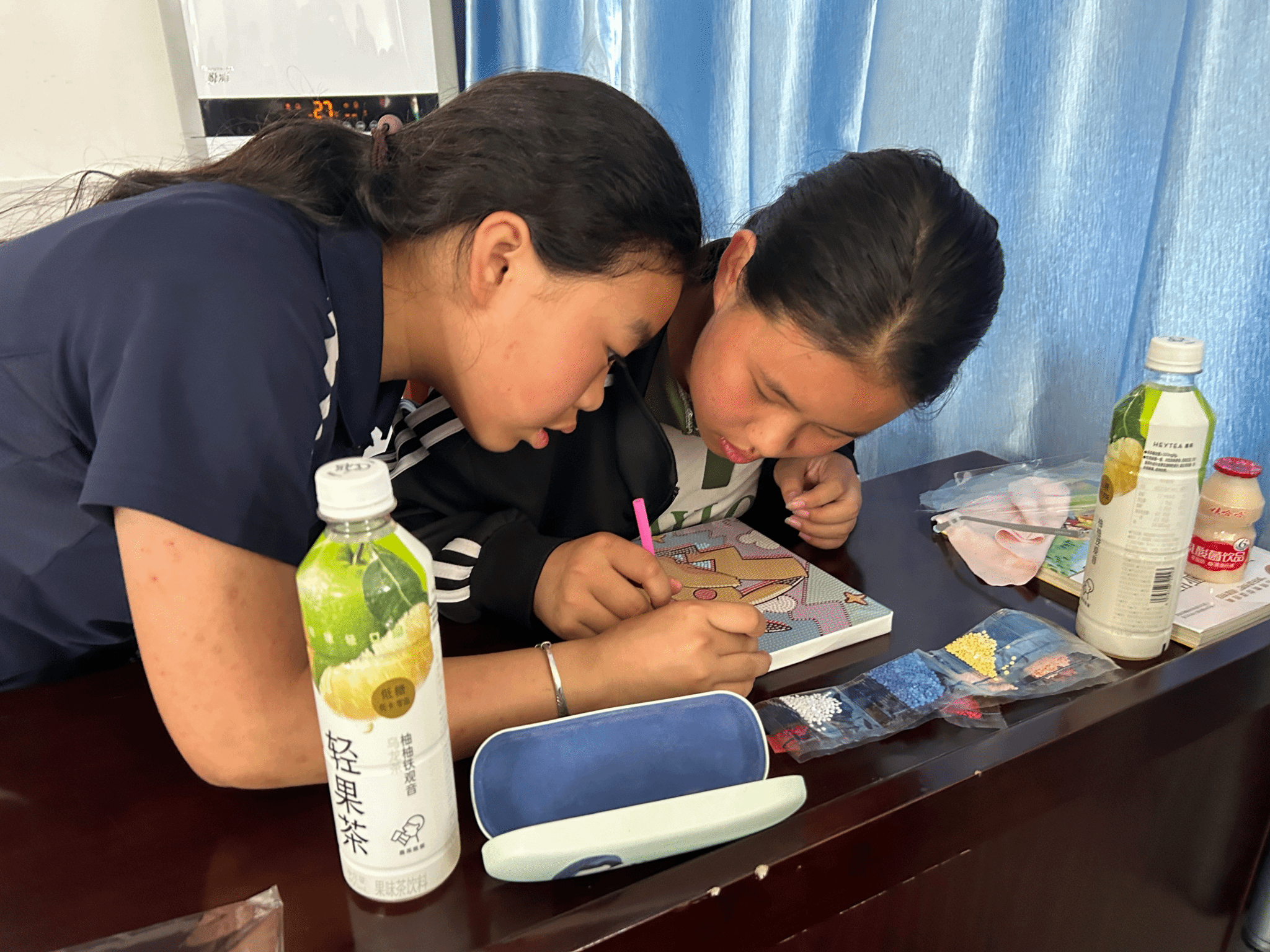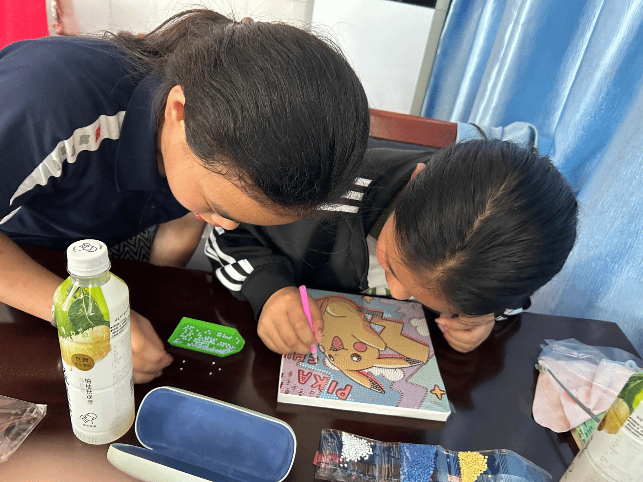活动开展中志愿者们向同学们征集意向,并分别发放钻石画、中国拼图、黏土。活动现场,璀璨夺目的“钻石”和精美的画框吸引着大多数小朋友的目光。大家满怀热情地投身到钻石画的创作中。从小心翼翼地挑选钻石,到细致地将它们粘贴在画布上,每一个步骤都饱含着参与者们的专注与用心。有的小朋友选择了中国拼图和黏土,在志愿者的协作下,一片片零碎的地理标图逐渐形成了一整个中国地图的样子,原本的黏土也加上了小朋友们的奇思妙想变得生动有趣。此次手工 DIY 拼图制作活动,不仅锻炼了参与者的动手能力和空间思维能力,更激发了他们的创造力和对中国版图的认识。同时,也为大家提供了一个放松身心、享受创作乐趣的平台。钻石画的制作不仅为小朋友提供了一个展现艺术才华的平台,更让大家在忙碌的生活中寻得了一份宁静与愉悦。通过亲手创作,参与者们收获了满满的成就感,同时也提升了审美能力和耐心。