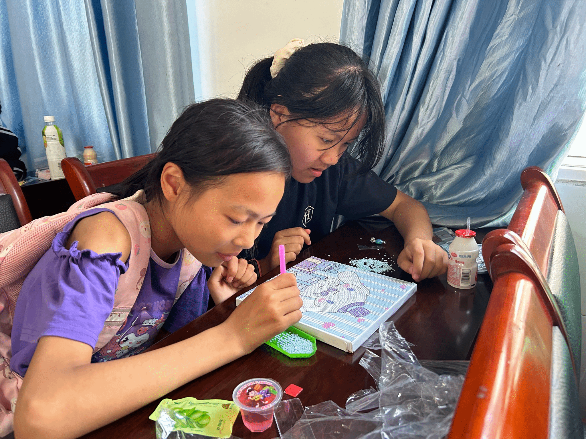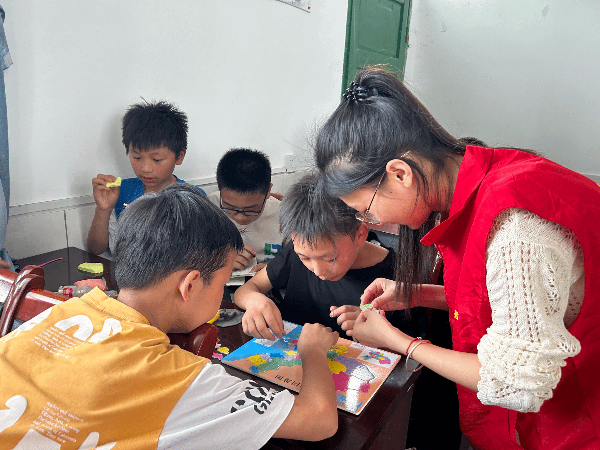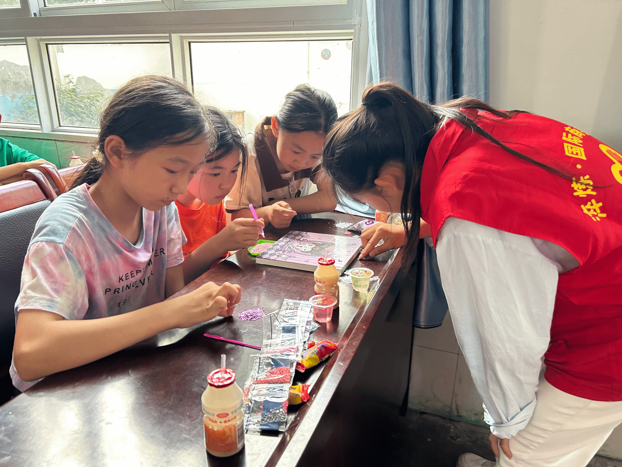 活动开展中志愿者们向同学们征集意向,并分别发放钻石画、中国拼图、黏土。活动现场,璀璨夺目的“钻石”和精美的画框吸引着大多数小朋友的目光。大家满怀热情地投身到钻石画的创作中。从小心翼翼地挑选钻石,到细致地将它们粘贴在画布上,每一个步骤都饱含着参与者们的专注与用心。有的小朋友选择了中国拼图和黏土,在志愿者的协作下,一片片零碎的地理标图逐渐形成了一整个中国地图的样子,原本的黏土也加上了小朋友们的奇思妙想变得生动有趣。此次手工 DIY 拼图制作活动,不仅锻炼了参与者的动手能力和空间思维能力,更激发了他们的创造力和对中国版图的认识。同时,也为大家提供了一个放松身心、享受创作乐趣的平台。钻石画的制作不仅为小朋友提供了一个展现艺术才华的平台,更让大家在忙碌的生活中寻得了一份宁静与愉悦。通过亲手创作,参与者们收获了满满的成就感,同时也提升了审美能力和耐心。