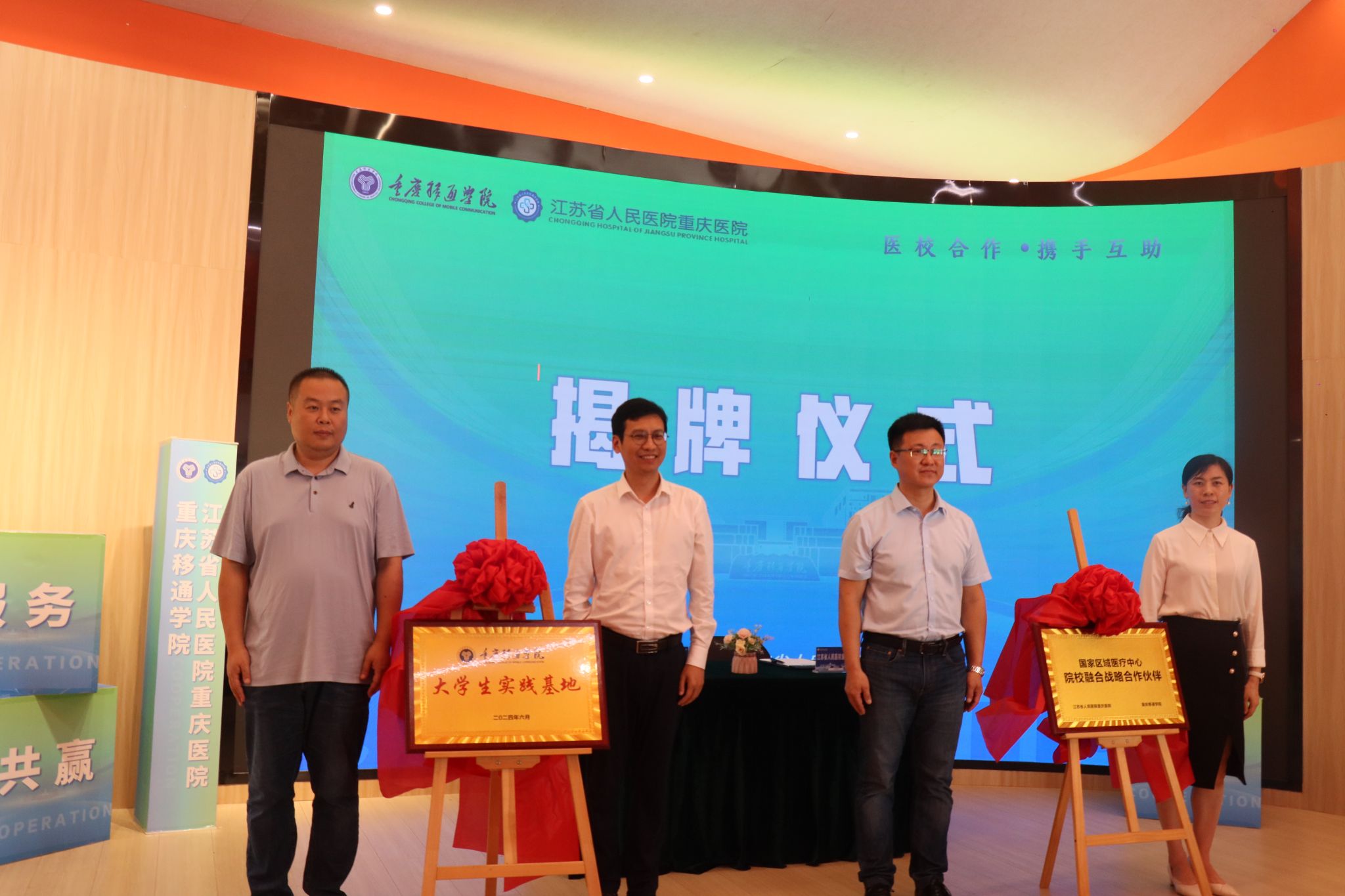 在现场人员的共同见证下,重庆移通学院校长助理梁少锋与江苏省人民医院重庆医院院长杨刚分别代表双方签订合作协议。战略合作协议的签订,代表着医校双方对于合作共建的共同决心,更是对共同目标的承诺,它标志着新的开始,意味着我们将携手并进、共同面对挑战,分享成功。随后,由重庆移通学院代表:校长助理梁少锋、大健康管理学院院长林毅与江苏省人民医院重庆医院代表:院长杨刚、副院长王呎芳上台,共同对“大学生社会实践基地”和“国家区域医疗中心院校融合战略合作伙伴”进行揭牌。