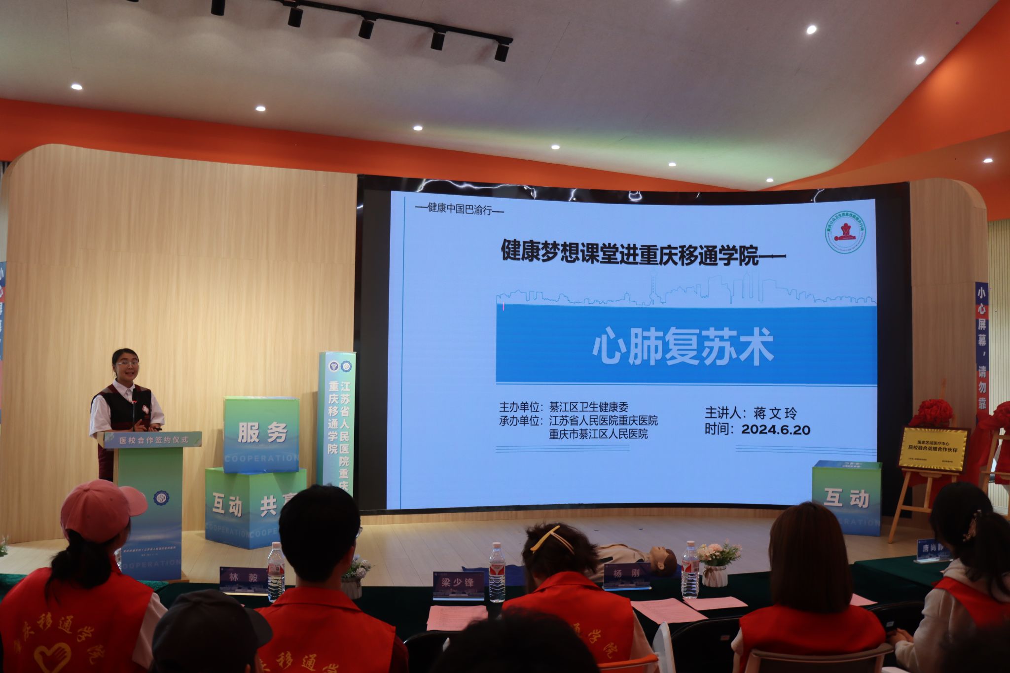 签约仪式最后,由江苏省人民医院重庆医院蒋文玲、石柳护士为“向日葵”医护服务志愿服务支队成员开展心肺复苏技能培训。现场每位同学热情高涨,认真学习技能细节。通过专业技能辅导,强化“向日葵”志愿服务支队专业性和多元化,提升成员专业化能力,为需要帮助的人提供细致、暖心的服务。