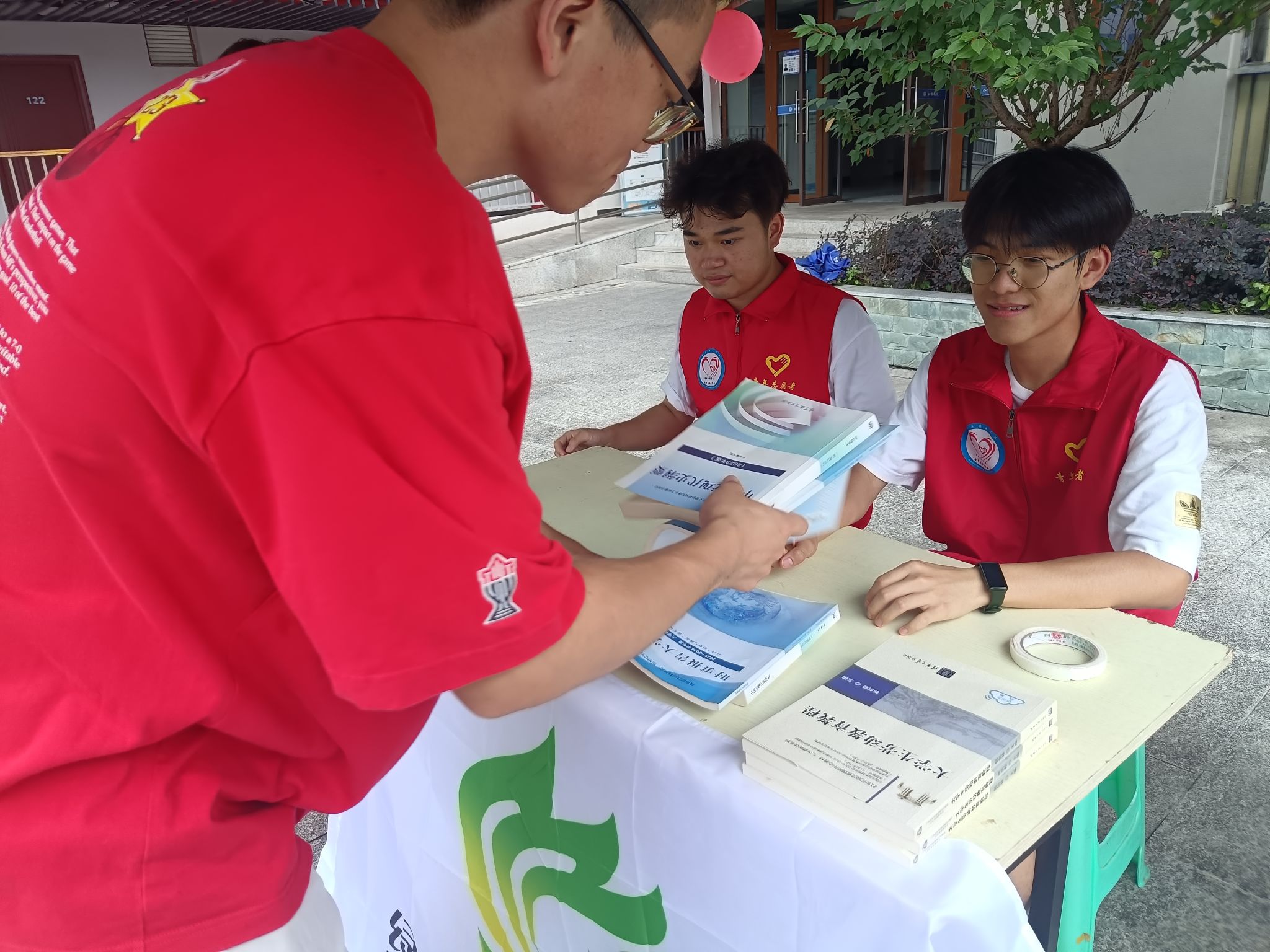 本次活动旨在通过为离校学子减负的同时实现资源的再利用,避免无意义的资源浪费。志愿者们在书院楼下就近支起活动的帐篷,方便离校学子返回宿舍拿取闲置学习资料进行互换。面对前来询问活动内容的学生,志愿者们耐心回答并帮助捐书的同学将书籍拿取至活动帐篷处。