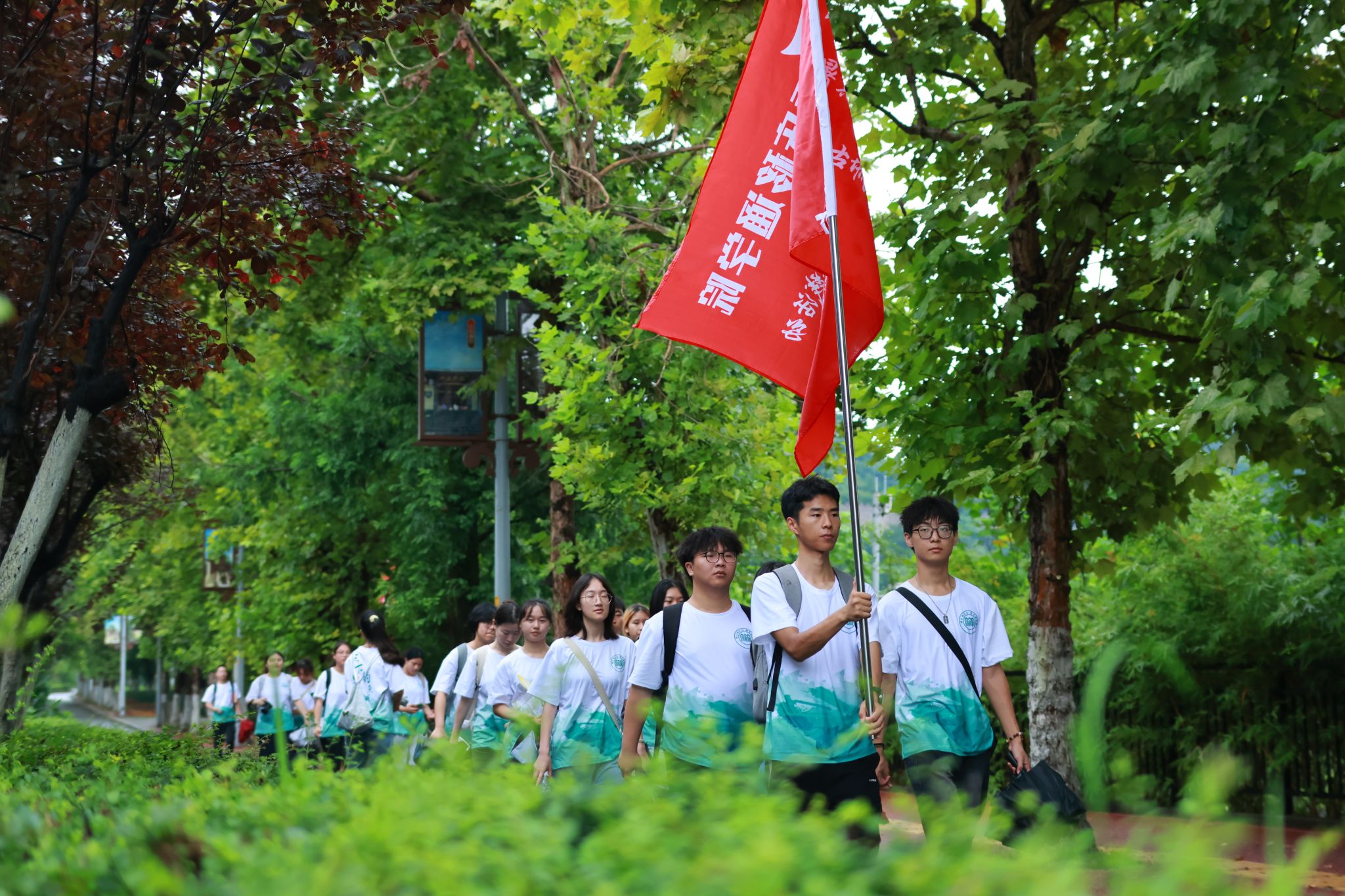 (图为实践团前往钓鱼城文化艺术村途中挥旗)