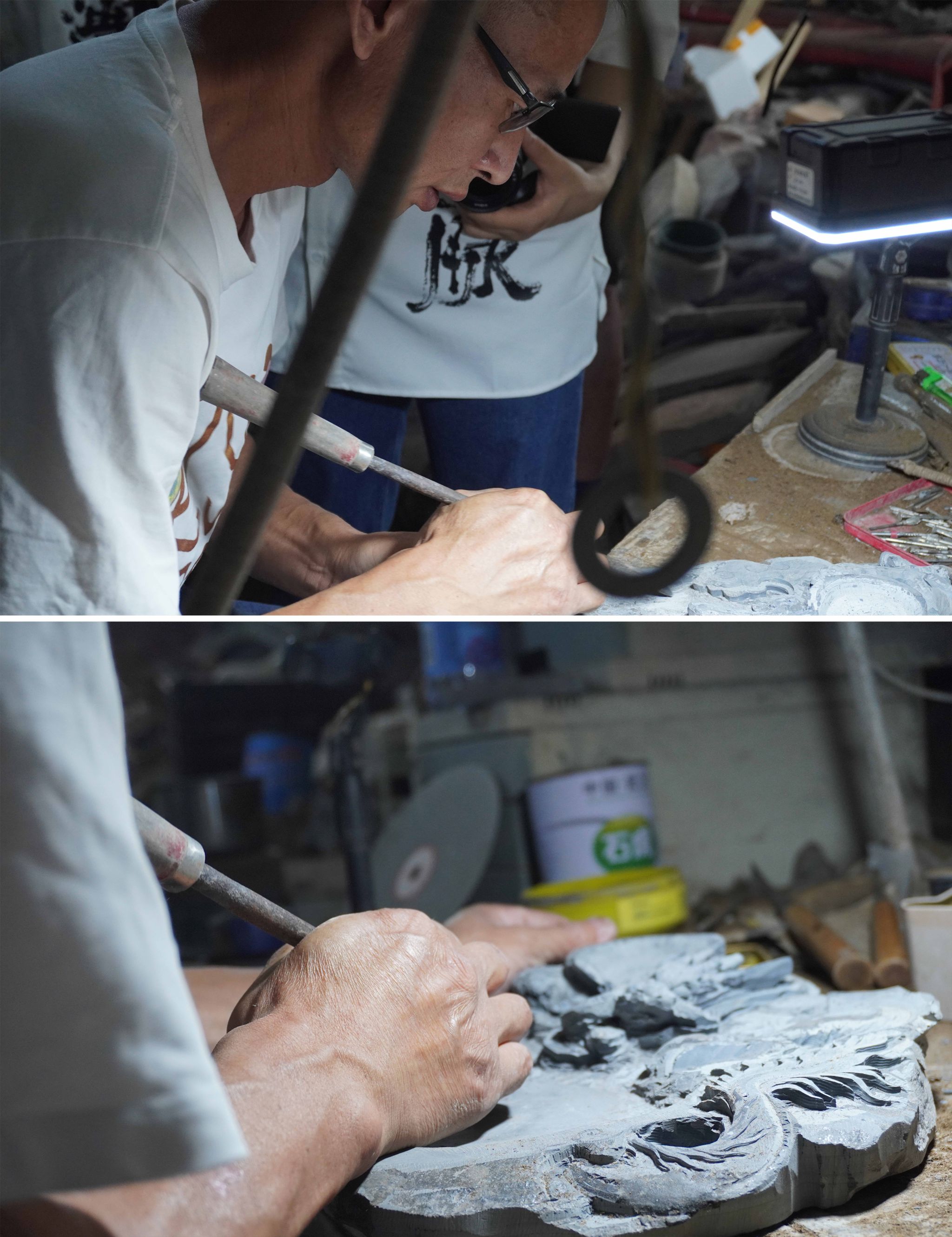下午2时,实践团到达合川区沥鼻峡砚石工艺厂,张礼雄老师首先拿出从工作室带来的雕刻工具,为实践团示范如何使用工具去刻画峡砚的雏形。张老师说:“雕刻峡砚需要耐心和细致,雕刻的过程中每一步都要脚踏实地,每一刀都要精确到位,根据原石的自然形状和纹理来设计雕刻的图案,才能使作品既美观又实用。”
