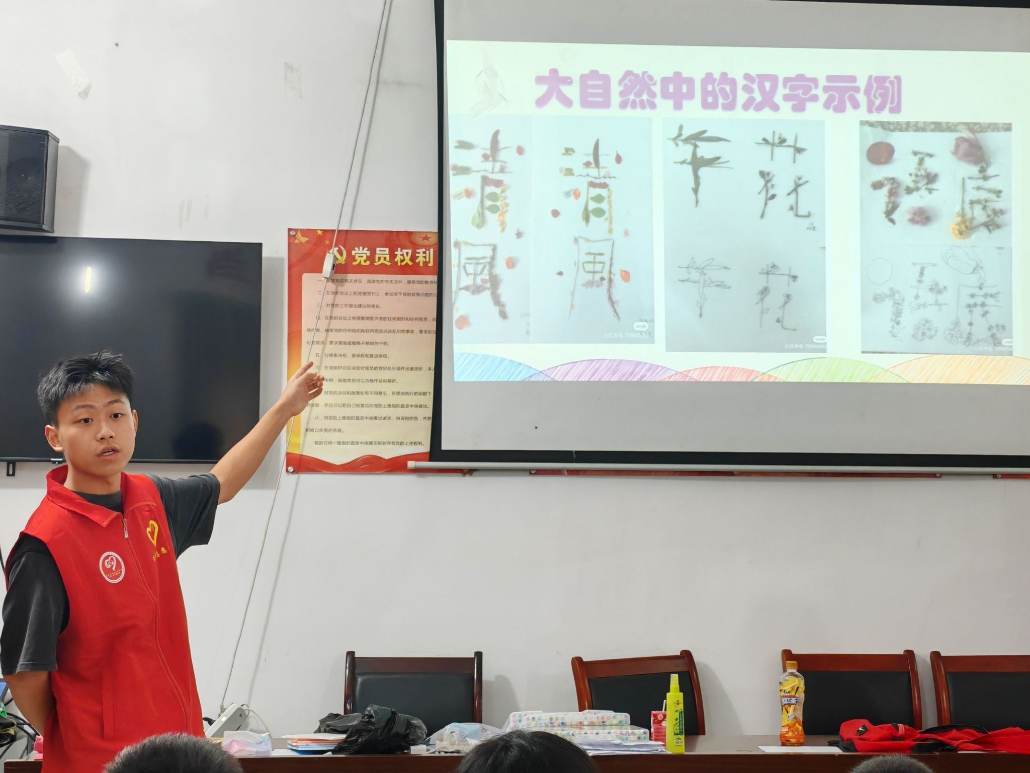 大自然中的汉字文化,作为中华民族悠久历史与灿烂文化的瑰宝之一,历经时代变迁与社会发展,始终保持着其独特的传承与发展轨迹。当天上午九时,“墨韵承情”志愿者团队身着统一的红色马甲,在振兴村举办了一场“词海探索”活动。活动中,小朋友们准时聚集,跟随志愿者穿梭于自然与文化交织的村镇小径,沿途收集形态各异的树叶与树枝,作为创作汉字艺术的自然素材。