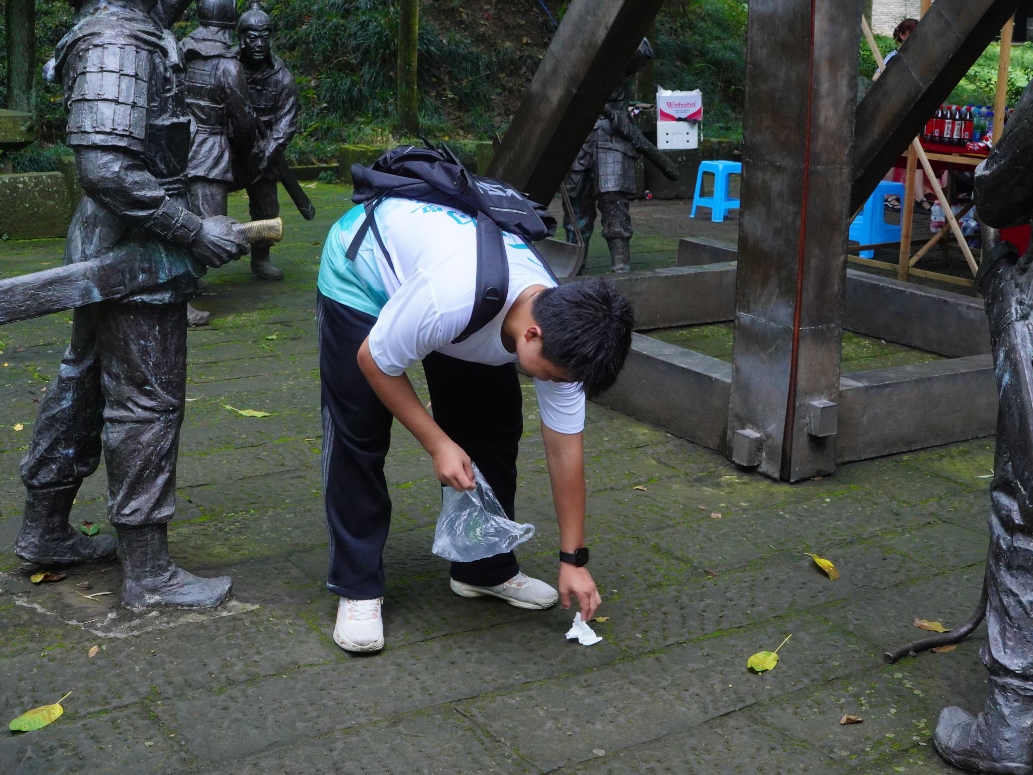 在参观与采访的同时,实践团还不忘记倡导文明旅游,呼吁大众保护钓鱼城的生态环境,推进钓鱼城的可持续发展。在景区内对乱扔乱丢现象耐心地进行劝导,并带领游客签署文明旅游承诺书。此外,实践团还以身作则,积极拾取景区内的垃圾,做到文明旅游从我做起。