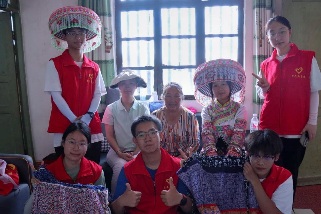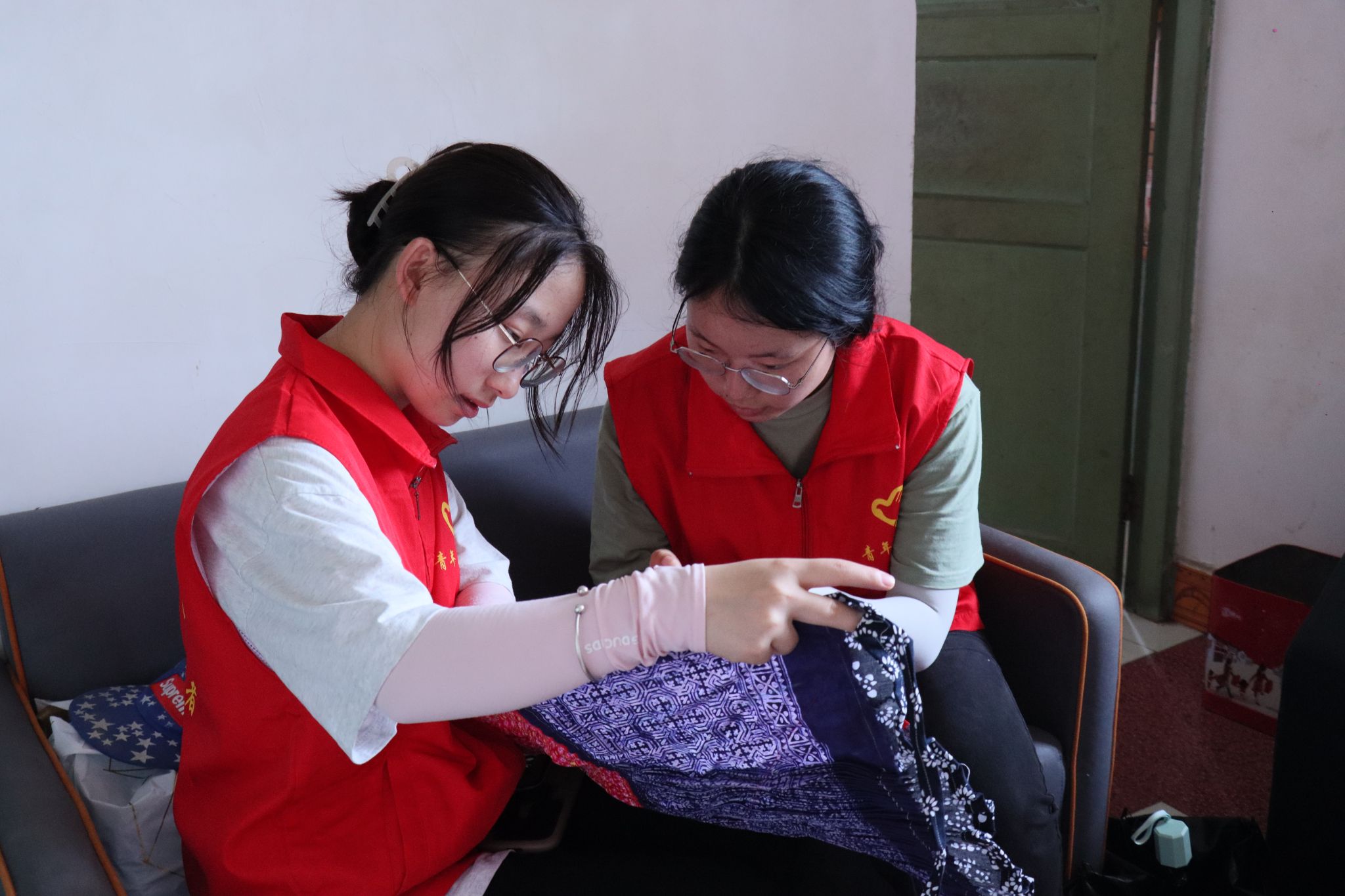 志愿者试穿了婆婆的手绣苗服,婆婆望着穿着苗绣服饰的志愿者,脸上洋溢的笑容久久不散。婆婆为志愿者们讲解时提及到她有三位女儿,大女儿、二女儿出嫁时穿的嫁衣是她们自己一针一线绣出来的嫁衣,今天志愿者穿的服饰是婆婆为即将出嫁的三女儿准备的嫁衣,苗家女儿出嫁的苗绣嫁衣是她们的底气亦是苗族文化在指尖上的传承。