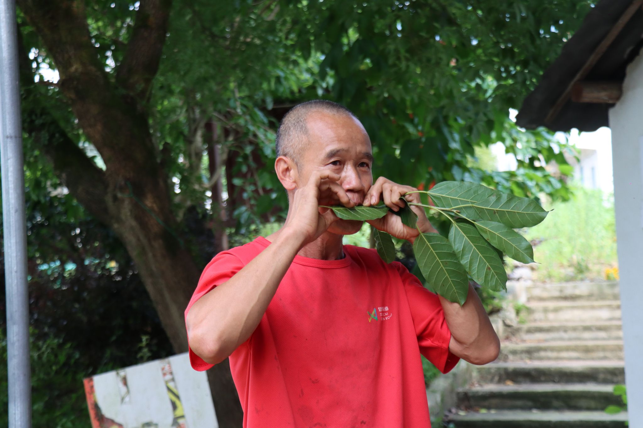 树叶,不只是树叶还可以是乐器。在石鼓村志愿者们还遇见了一位有趣的令狐先生,片片叶子在令狐先生那吹出了动听的声音。令狐先生给志愿者们介绍到“吹叶”也是苗家文化的一种,但在石鼓村2000住户中仅有100余家苗户,而“吹叶”这项苗族文化渐渐淡去,令狐先生也是借助新媒体学习与传承这份古老的技艺。