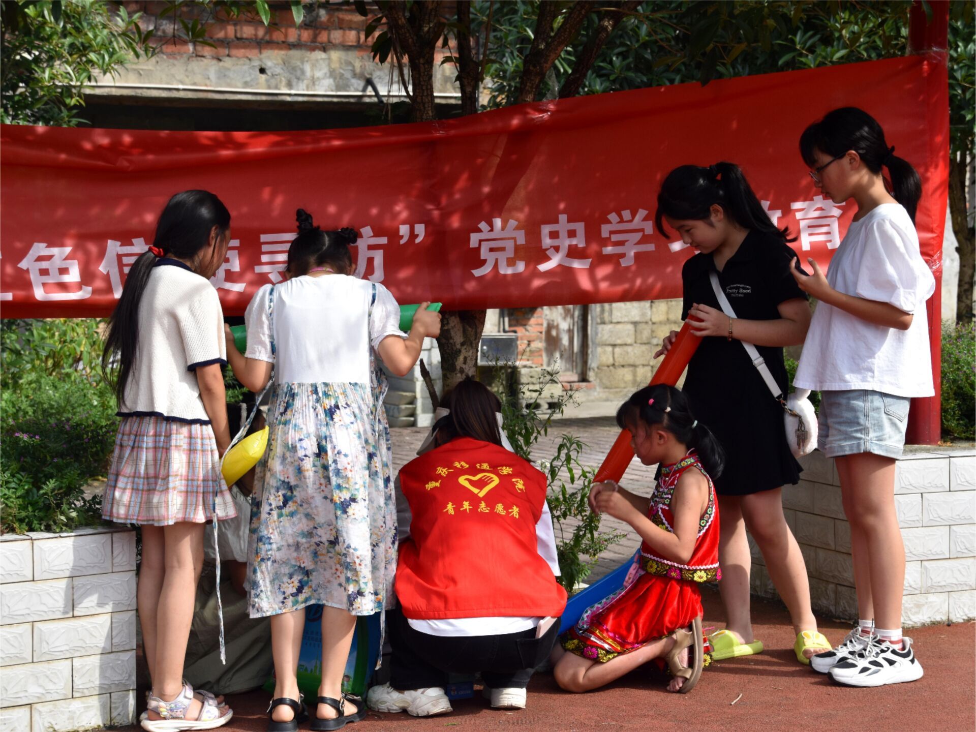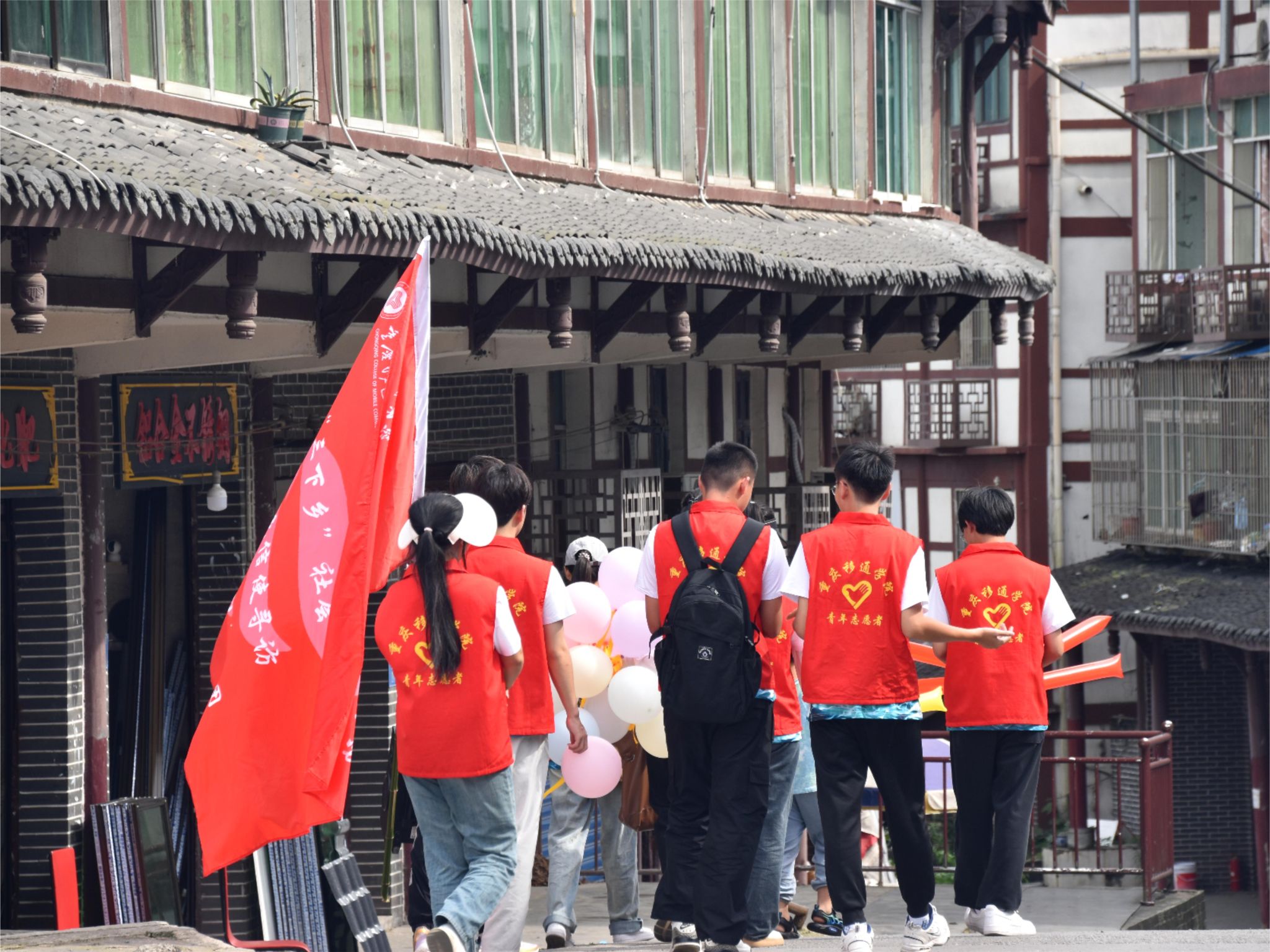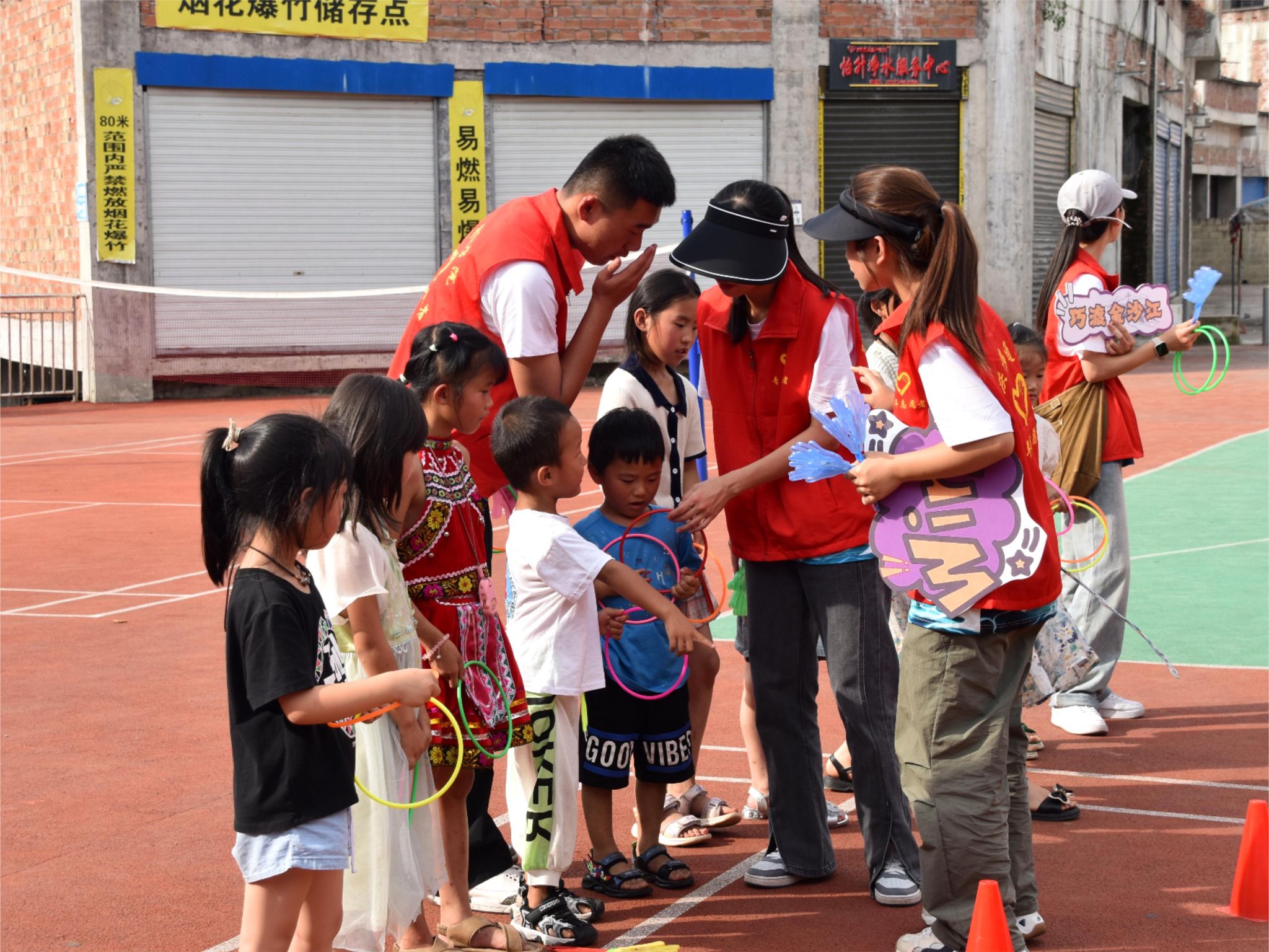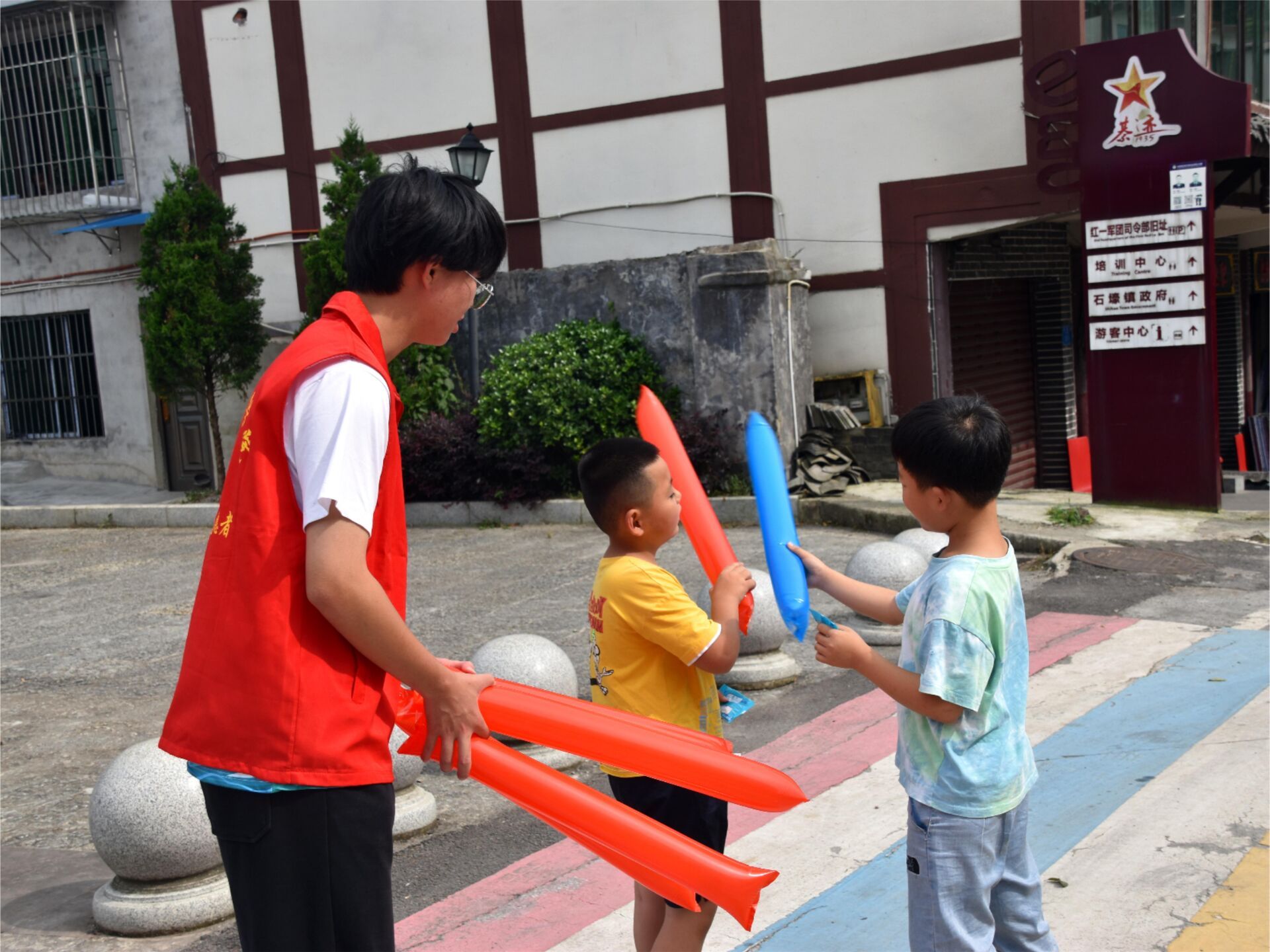 夏日的晴空是明媚的,红色信使们整装待发,整齐有序,统一身披红马甲,前往石壕镇广场。一路走来,志愿者唱起红歌,邀请小朋友们加入。歌声响起,伴随着红色文化传响整个石壕小镇。放眼石壕广场望去,志愿者们正一同布置“红色足迹·展现青春风采”趣味运动会场地,大家分工合作,井然有序,力求准备工作做到最好。红色信使们的热情邀请和小朋友的积极参与融合在一起,现场红色氛围愈加浓烈。