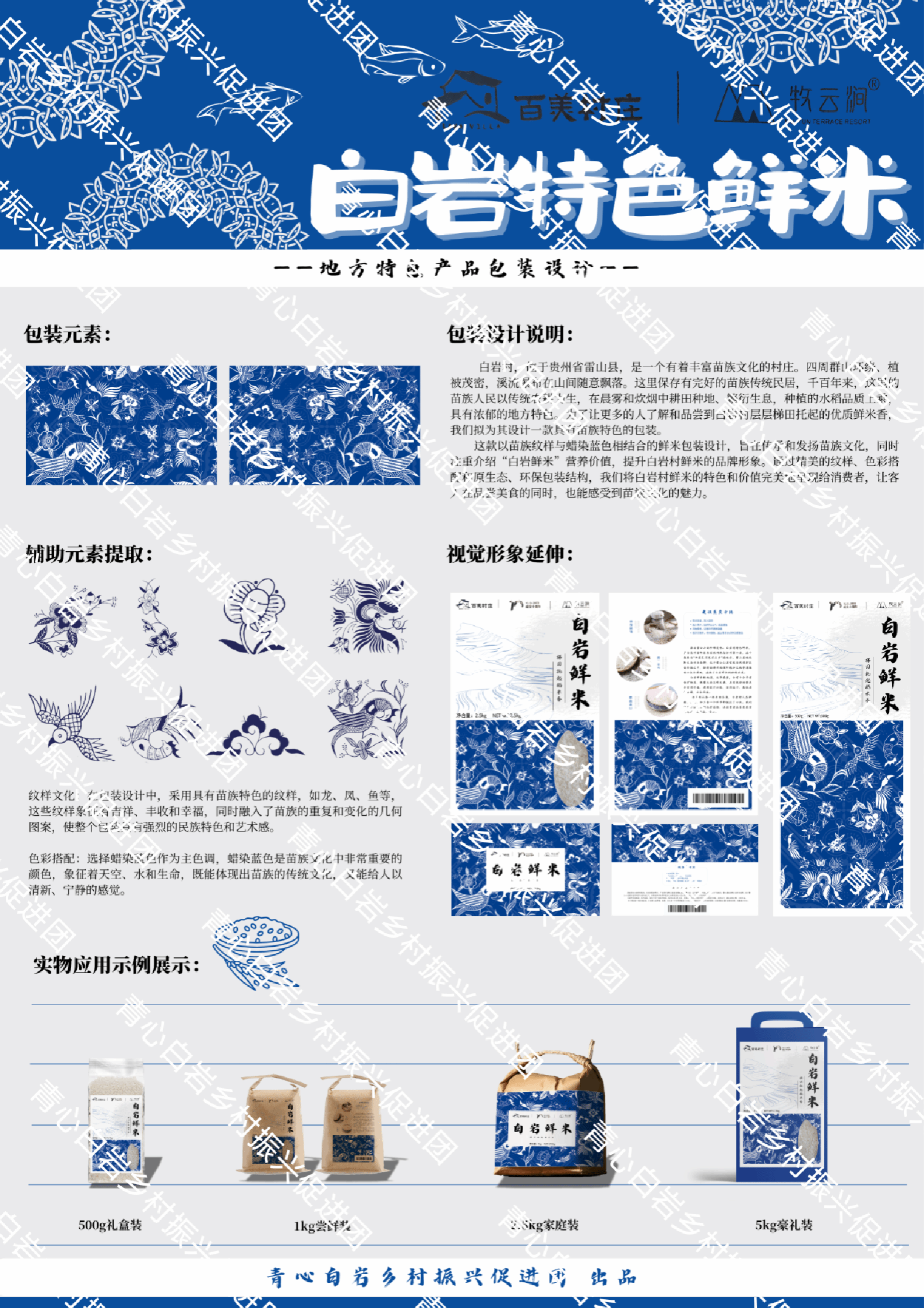 于是,白岩大米的包装上,变成了流动的苗族文化长廊,龙、凤、鱼等吉祥物跃然其上,寓意着丰收与幸福;几何图案的巧妙融合,让传统与现代和谐共生;而那抹蜡染蓝,如同天空般深邃,水般清澈,诉说着生命的活力与希望,通过这种色彩的运用,包装不仅展现了苗族的传统文化,也为消费者带来了视觉上的享受。团队成员还为大米包装设计了很多小细节,大米包装分为多个规格,包括500g礼盒装、1kg尝鲜装、2.5kg家庭装和5kg豪华装,不同规格的包装满足了各类消费者的需求,让每一份选择都充满温度,通过这样的分级,不仅可以更好地展示产品的特色,也方便消费者根据自己的实际情况进行选择。