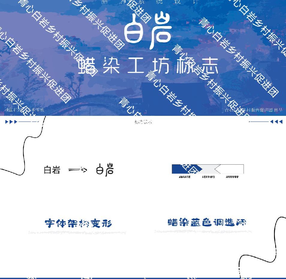 为了进一步助力乡村旅游业,除了大米包装袋的设计,团队还设计了白岩村蜡染工坊标志,并为蜡染工坊制作了宣传展板,宣传展牌上,蜡刀与染料桶的生动形象吸引着过往行人的目光,让人不禁想要亲身体验一番这项古老的技艺。同时,团队还配套设计了一系列宣传和实用物品,一次性水杯与毛毡片的设计也融入了蜡染元素,以蜡染的白色为背景,中间镶嵌着蓝色的白岩logo图,文创周边的设计落地使用后,可以让苗族蜡染的元素融入游客的住宿体验中,提高白岩文化的传播。