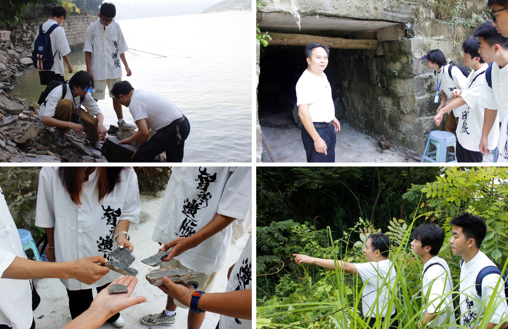 为揭开合川峡砚来源的神秘面纱,实践团成员亦跟随合川峡砚传承人王卫国老师的步伐,来到嘉陵江沥鼻峡一段的江边,走过泥路,爬上险山,进入洞穴,到达合川峡砚早期取石地之一。五十年如一日,矫健的上下山身姿并非数日练成,对合川峡砚的坚守与传承也并非数年之行,王卫国老师用坚定的眼神、诚挚的语言、宽厚的背影向实践团成员们讲述着自己传承合川峡砚的故事,虽无一语,但却满是情谊。