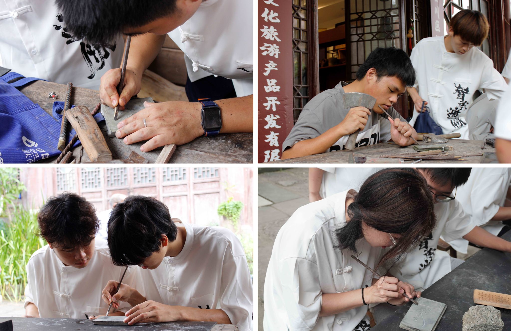 访谈结束后,实践团成员跟随张礼雄老师的步伐,抵达合川区沥鼻峡砚石工艺厂,与合川峡砚传承人张礼雄、杨世宏、谭郡府、李祖元四位老师一起,体验雕刻峡砚的传统技艺。在工艺厂(或称传习场),实践团成员手持刻刀,与石头对话,感受峡砚、感受历史。在学习峡砚雕刻技艺的同时,亦感受到了非物质文化遗产的文化底蕴。