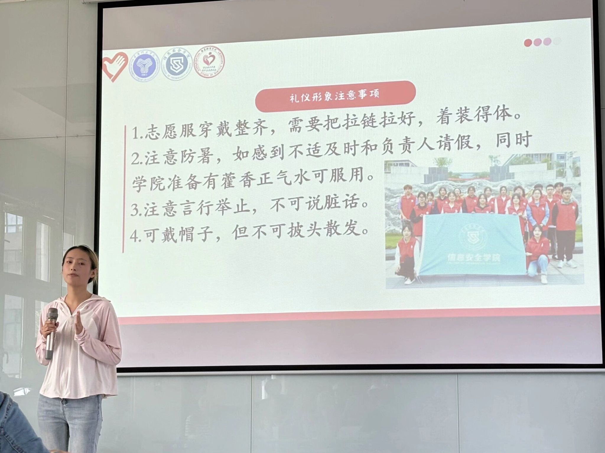 讲解人王吉青不仅细致入微地传授了志愿服务精髓,还贴心地关怀着每位志愿者的身心健康。她特别提醒,夏日炎炎,大家需时刻注意防暑降温,学院已备好藿香正气水等防暑药品,以备不时之需。同时,为展现最佳形象,信息安全学院团总支青年志愿者协会统一配备了志愿服,确保每位志愿者以饱满的精神面貌投入工作。前期筹备中,更是事无巨细,从路线规划到物资准备,确保活动顺利进行,让志愿者在服务他人的同时,也能感受到团队的温暖与关怀。