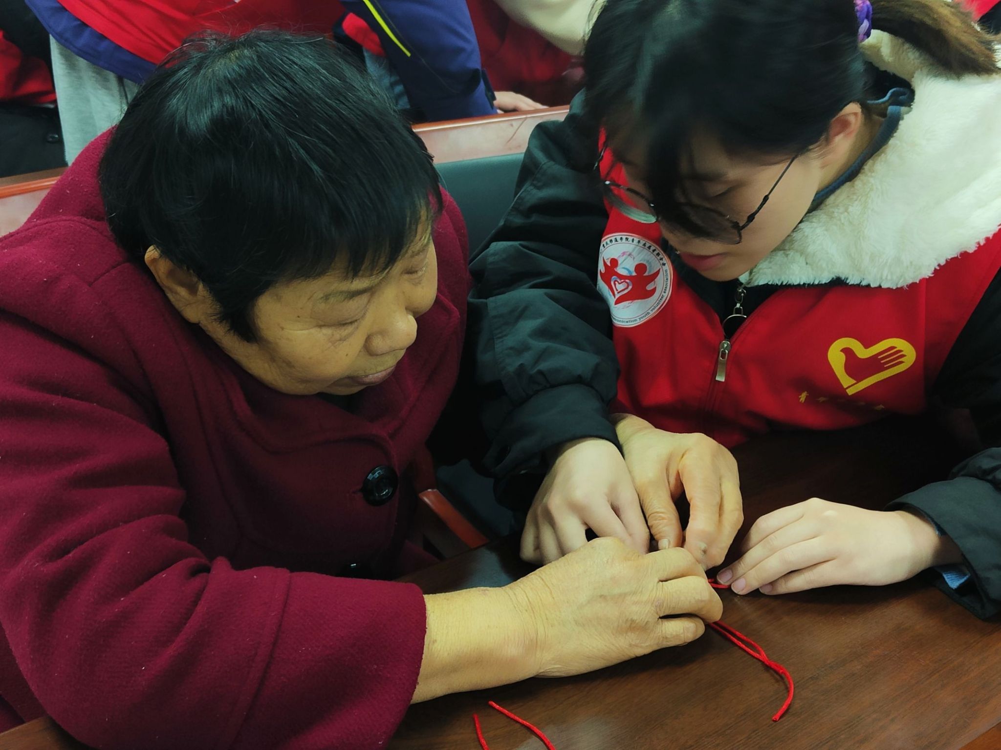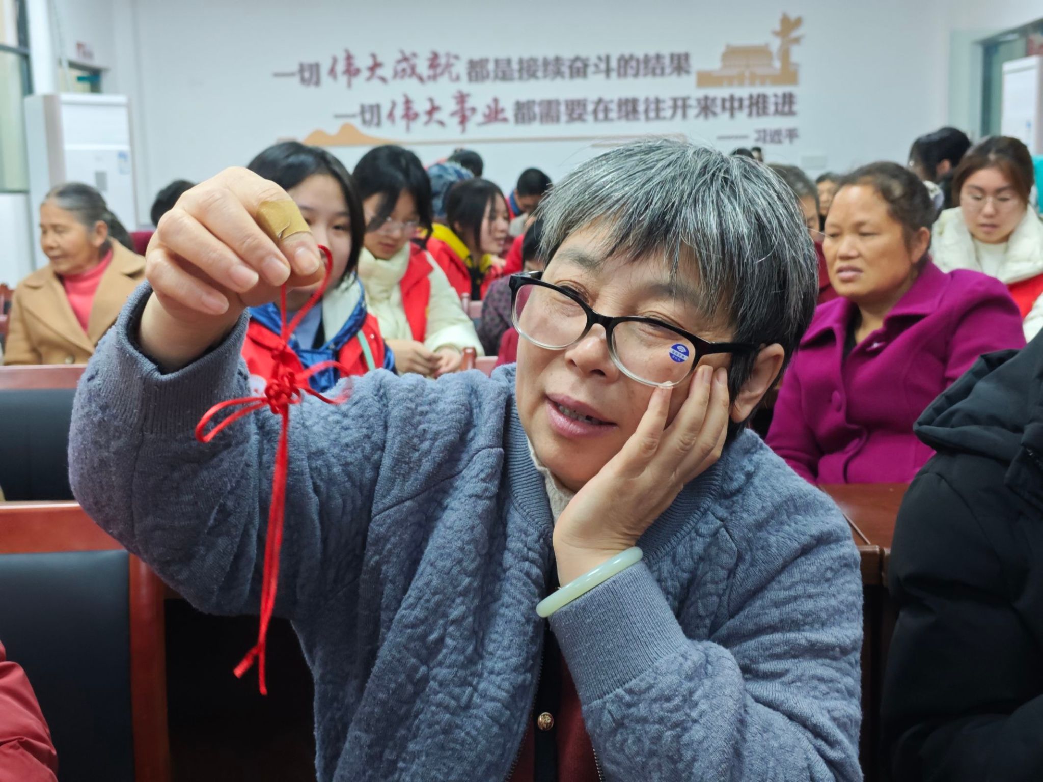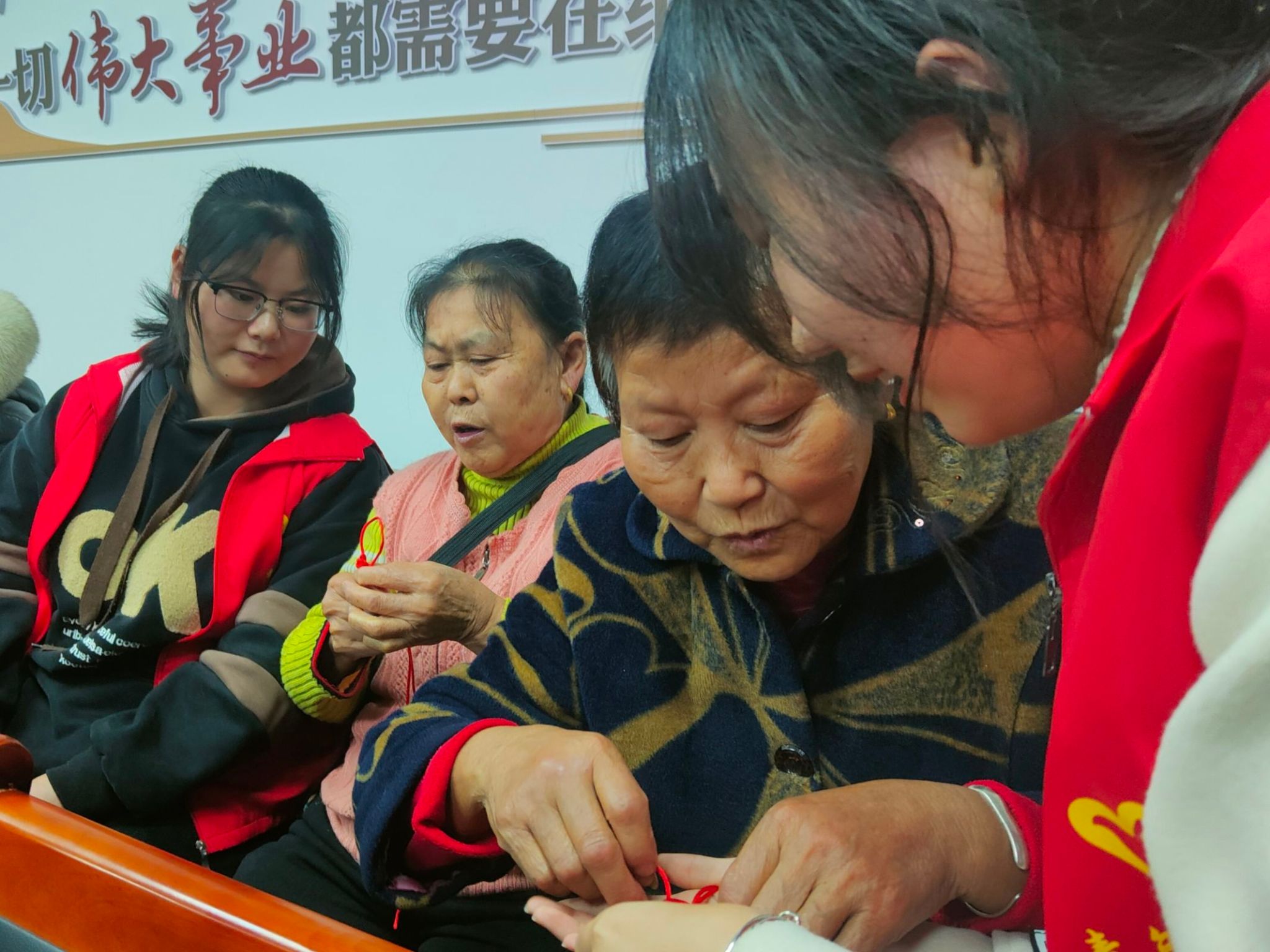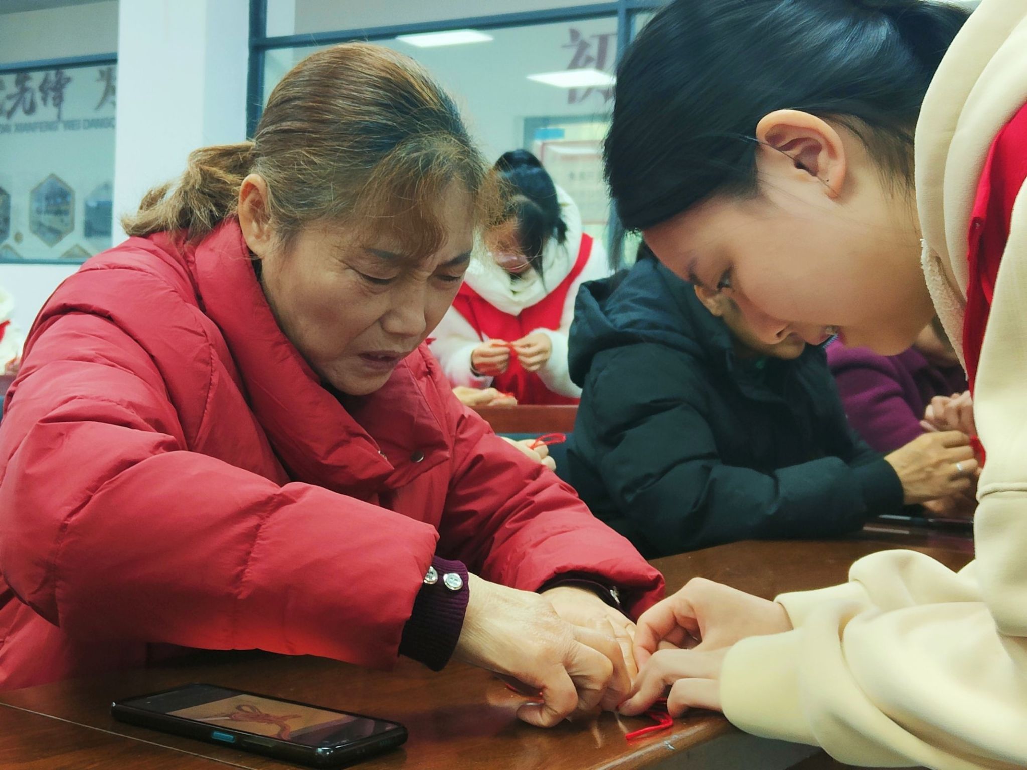 从“双联结”开始,志愿者一步一步地演示,中老年人认真学习,紧盯着志愿者手中的丝线。在共同努力下,中国结逐渐在手中成型,他们脸上露出自豪的笑容。