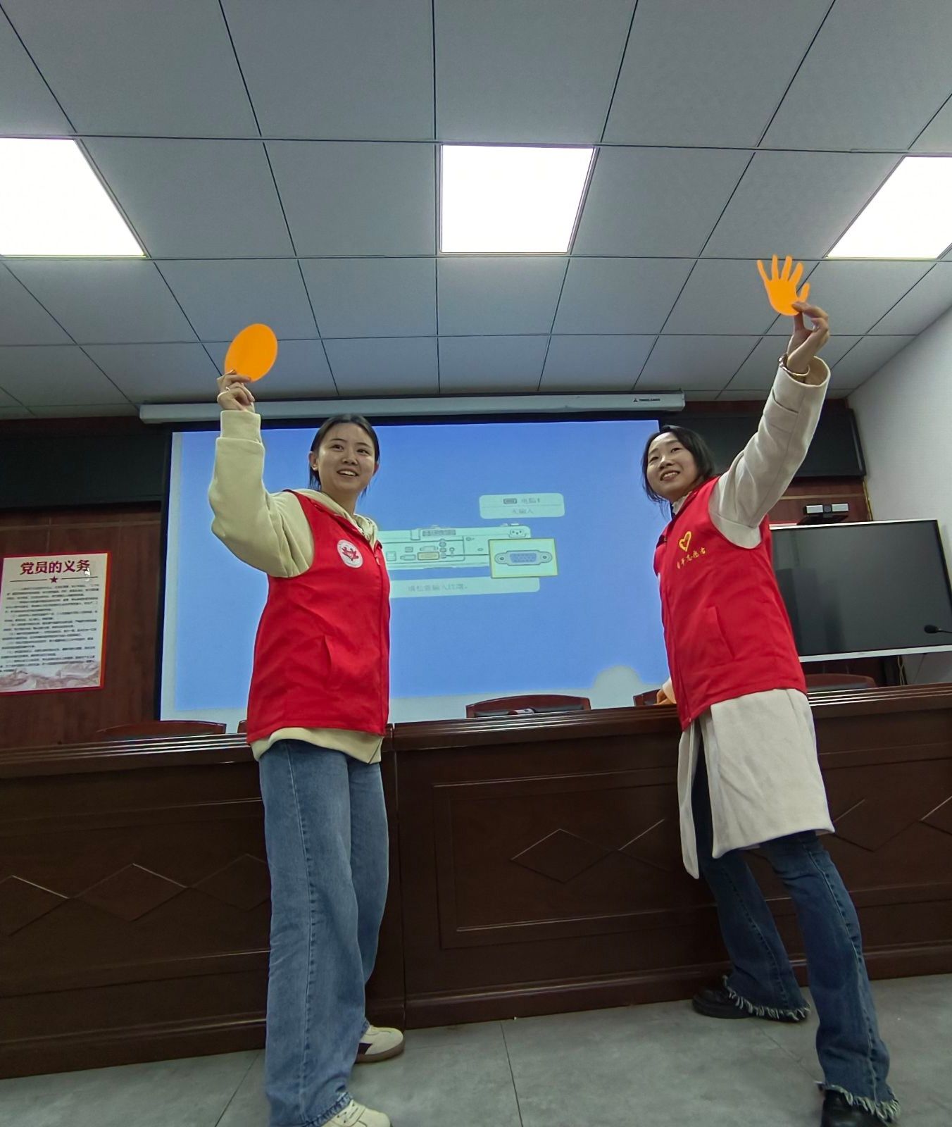 志愿者用圆形和手掌形卡纸引导中老年人做手势,带领全场活动起来。视觉障碍的老年人在志愿者引导下也能参与进来,整个会议室内,大家凝神专注,共同为这个游戏助力精彩。