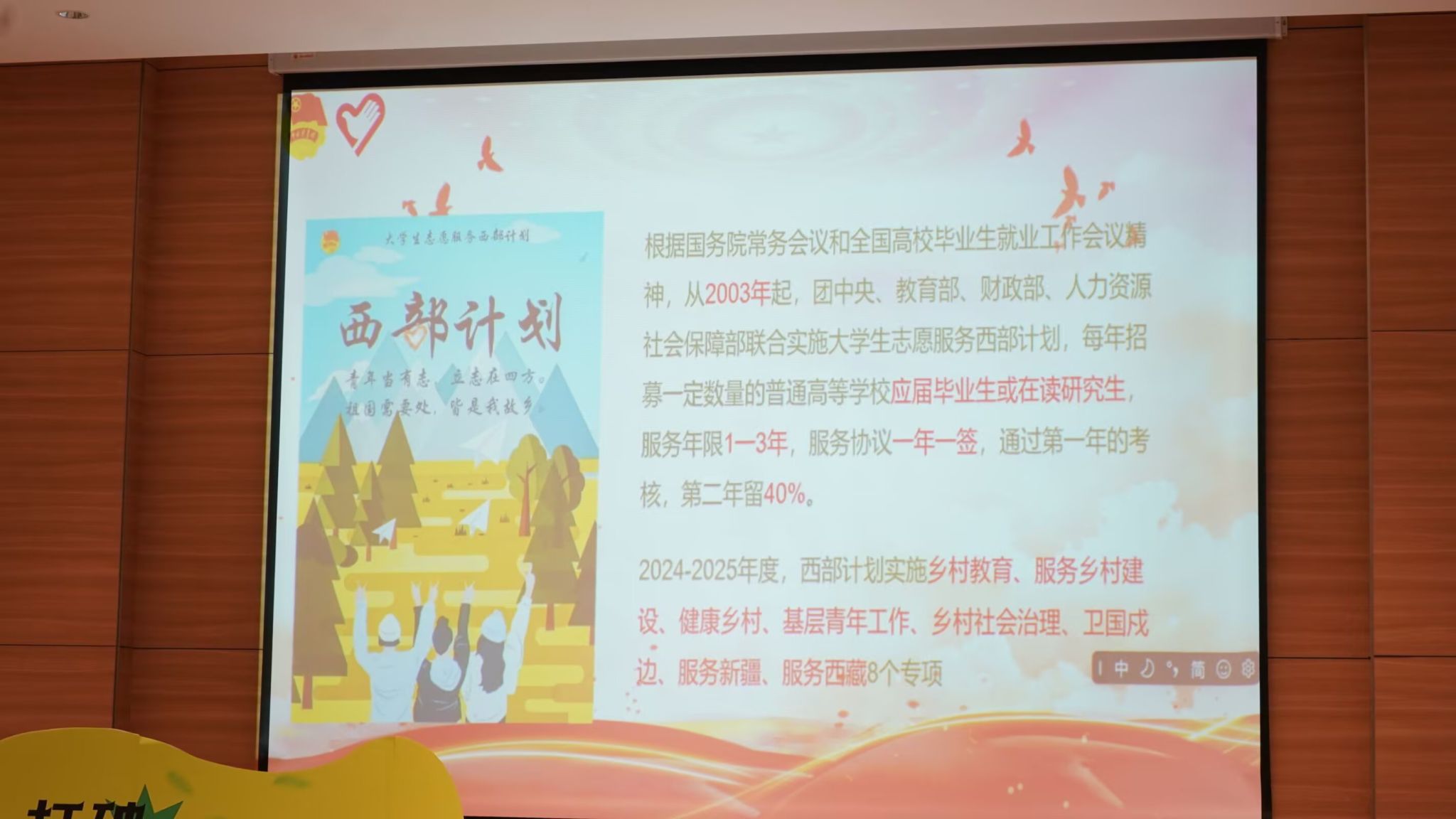为鼓励广大青年积极投身西部建设,展现实践价值与成长路径。重庆移通学院艺术传媒学院青年志愿者协会于2025年3月18日12:00在六度空间·创梦空间举办了一场西部计划分享会。
