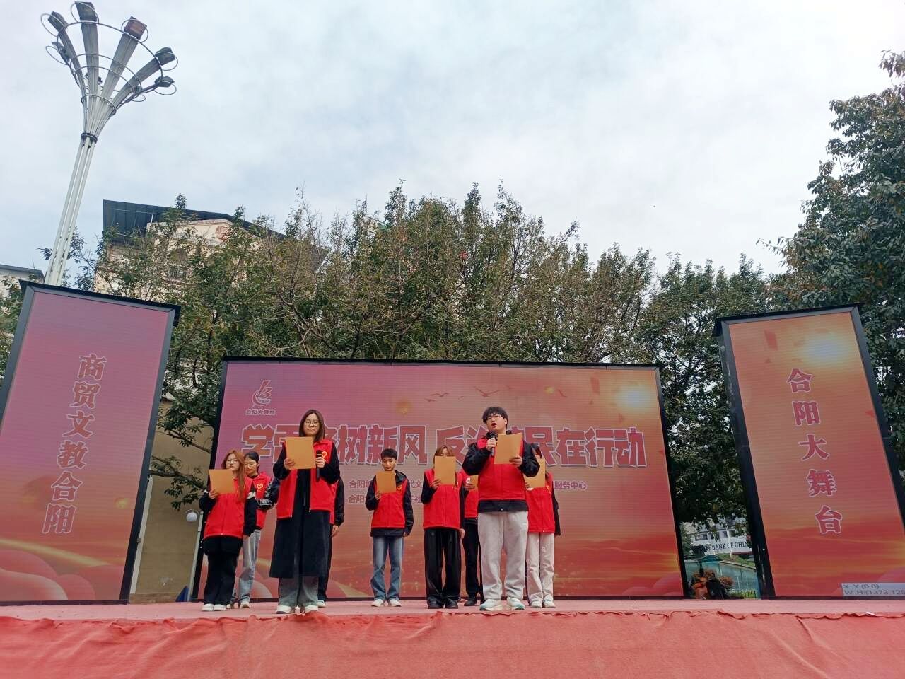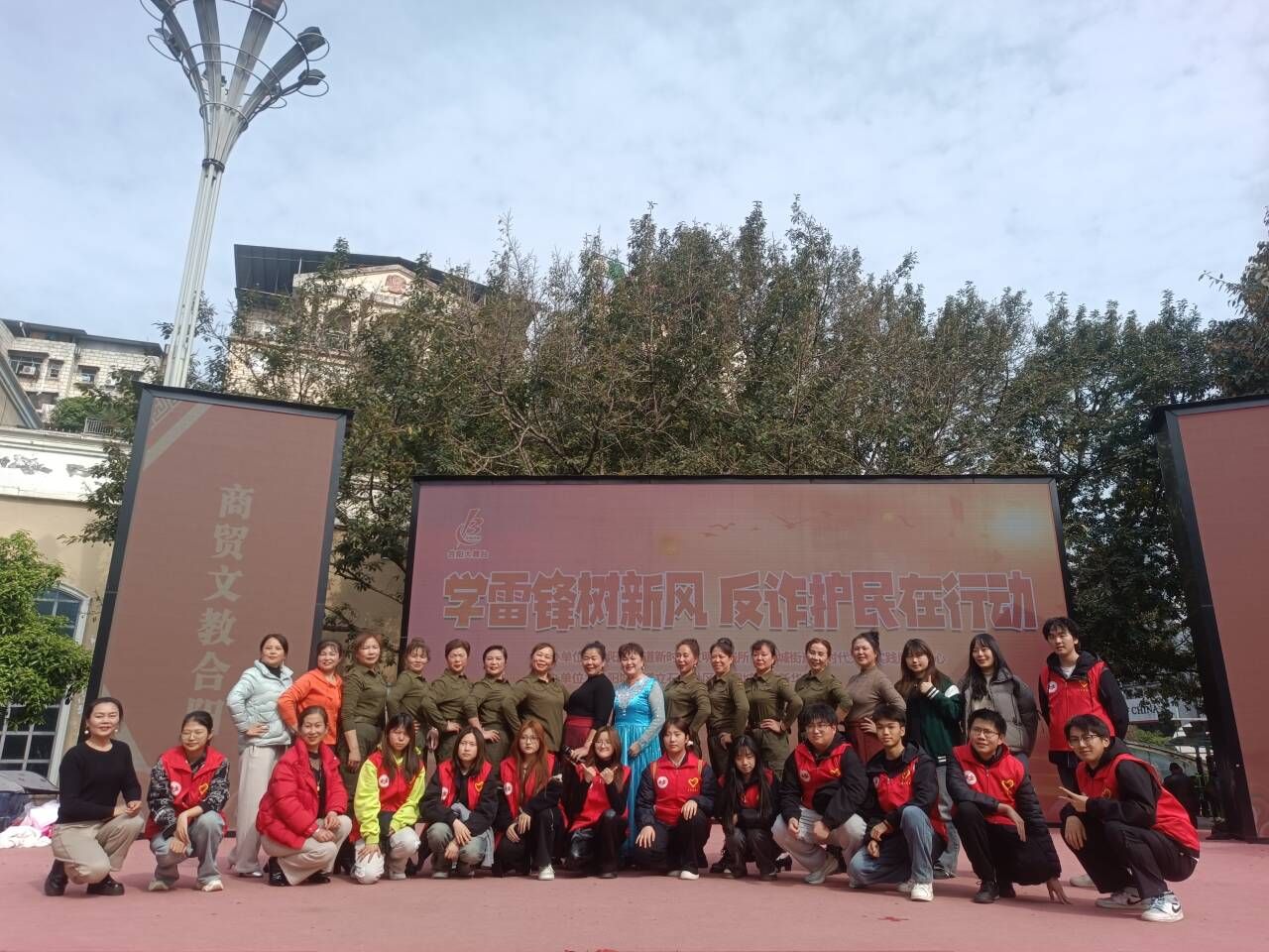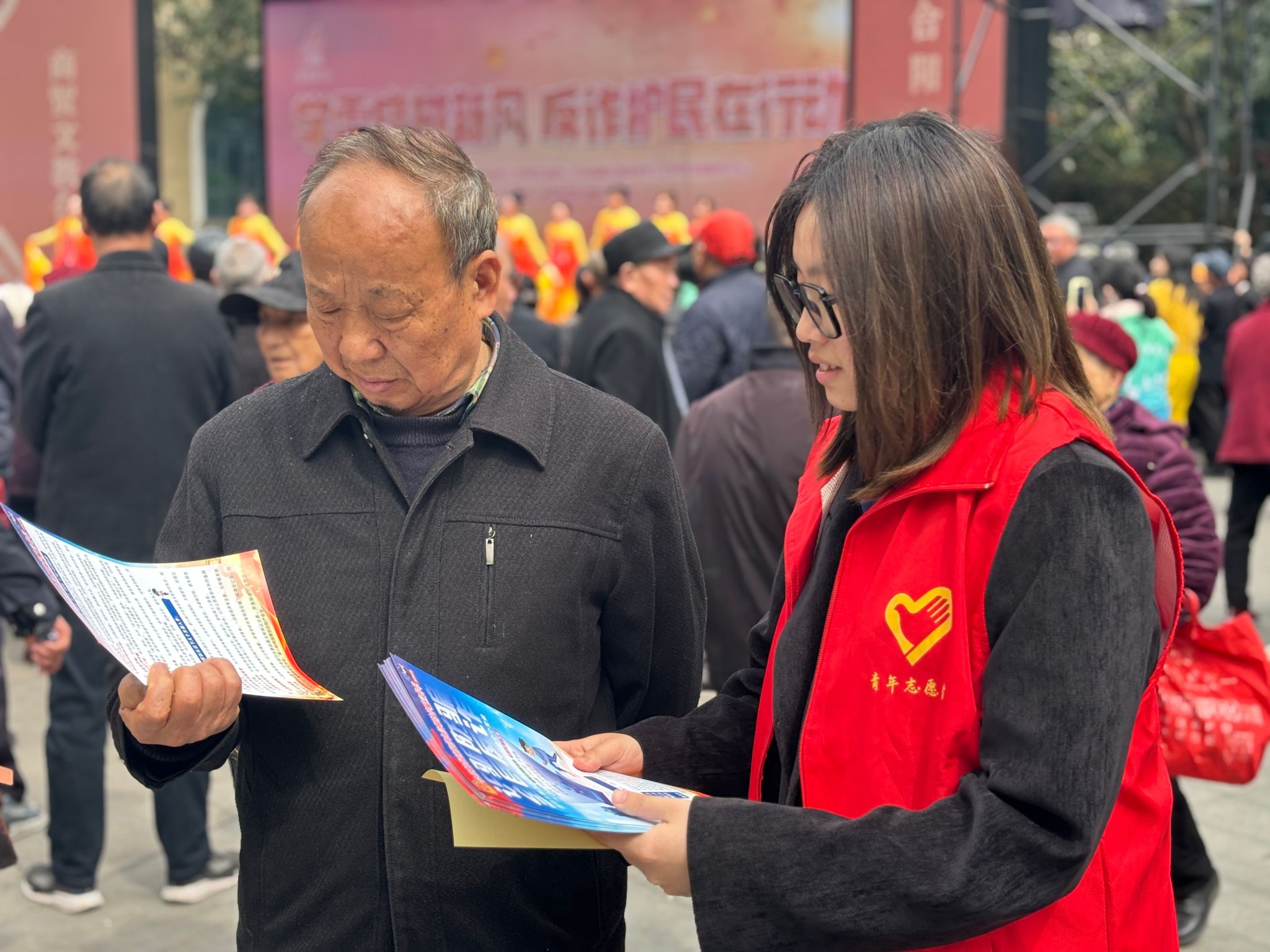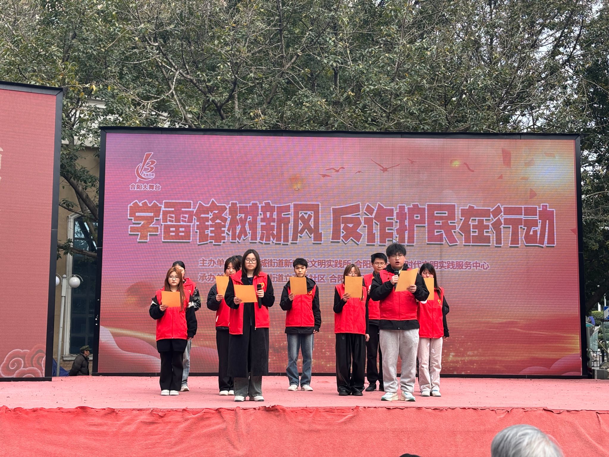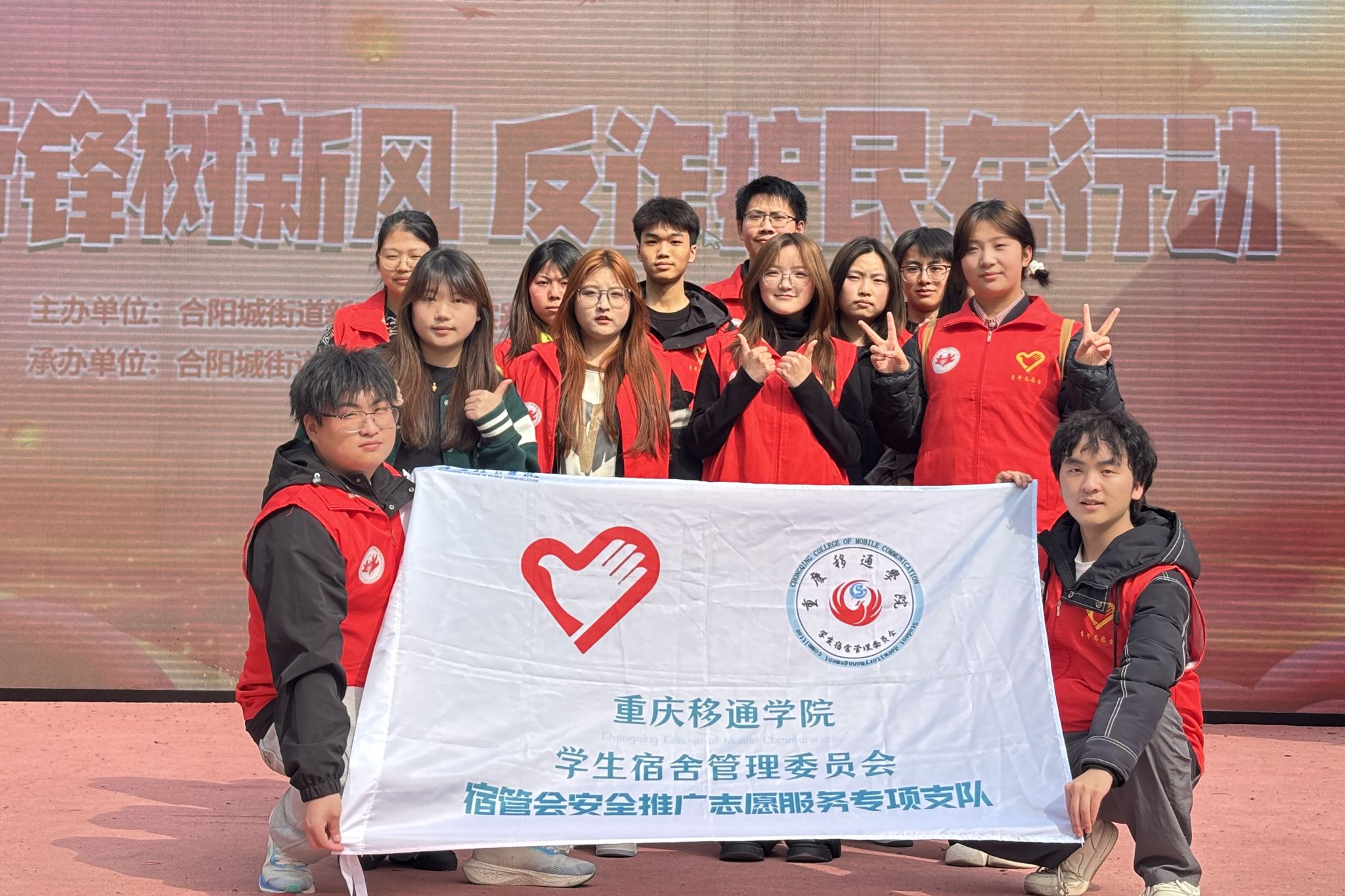 4月2日14:30,由新华社区与立石子社区联合主办的“学雷锋树新风,反诈护民在行动”大型公益活动在合川区塔耳门广场合阳大舞台隆重举行,学生处宿舍管理中心周佳艺老师带领宿管会安全推广志愿服务支队15名志愿者,作为特邀表演团队全程参与,通过主题朗诵和现场宣传相结合的方式,为社区居民带来了一场别开生面的反诈宣传教育。