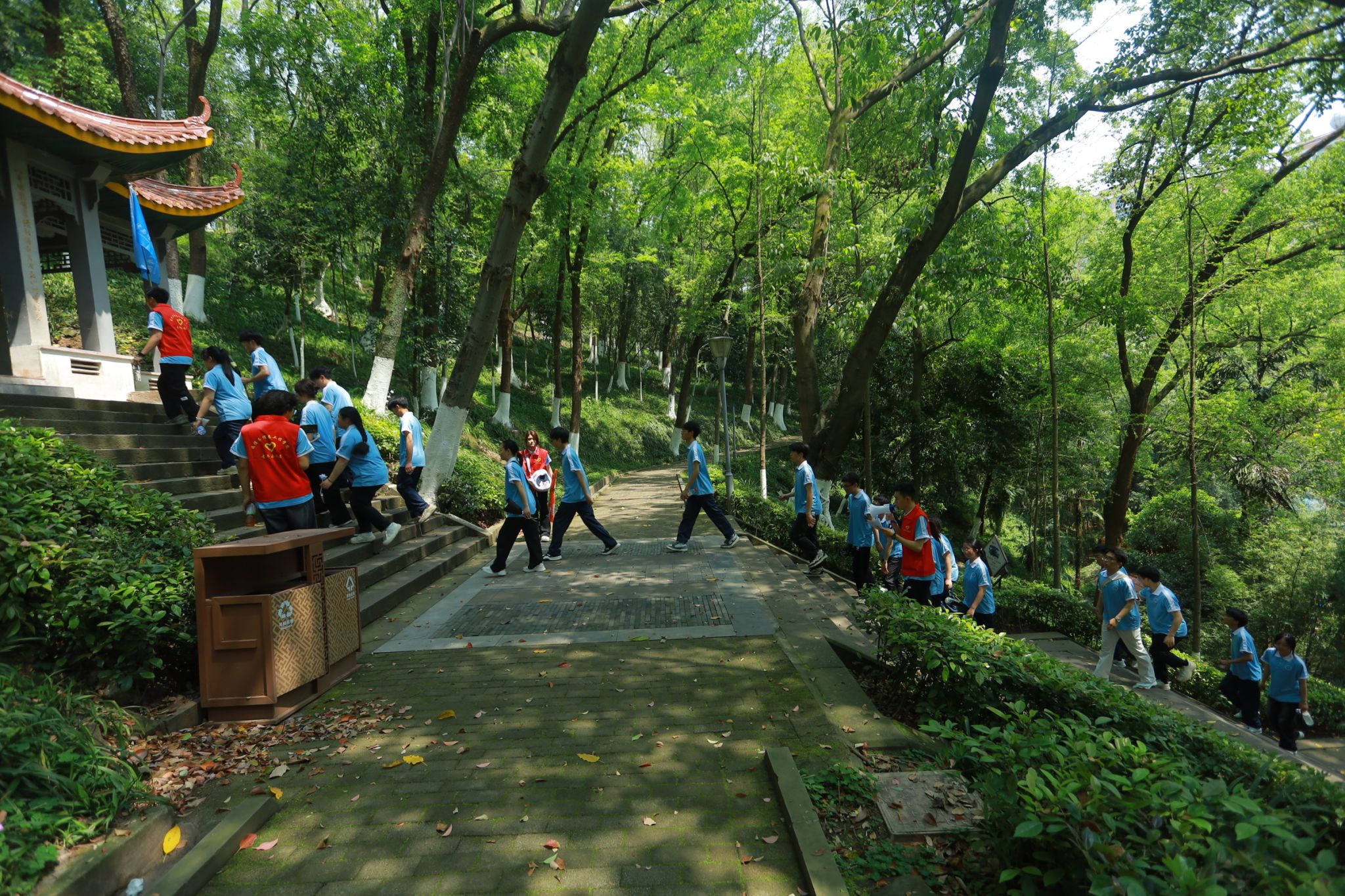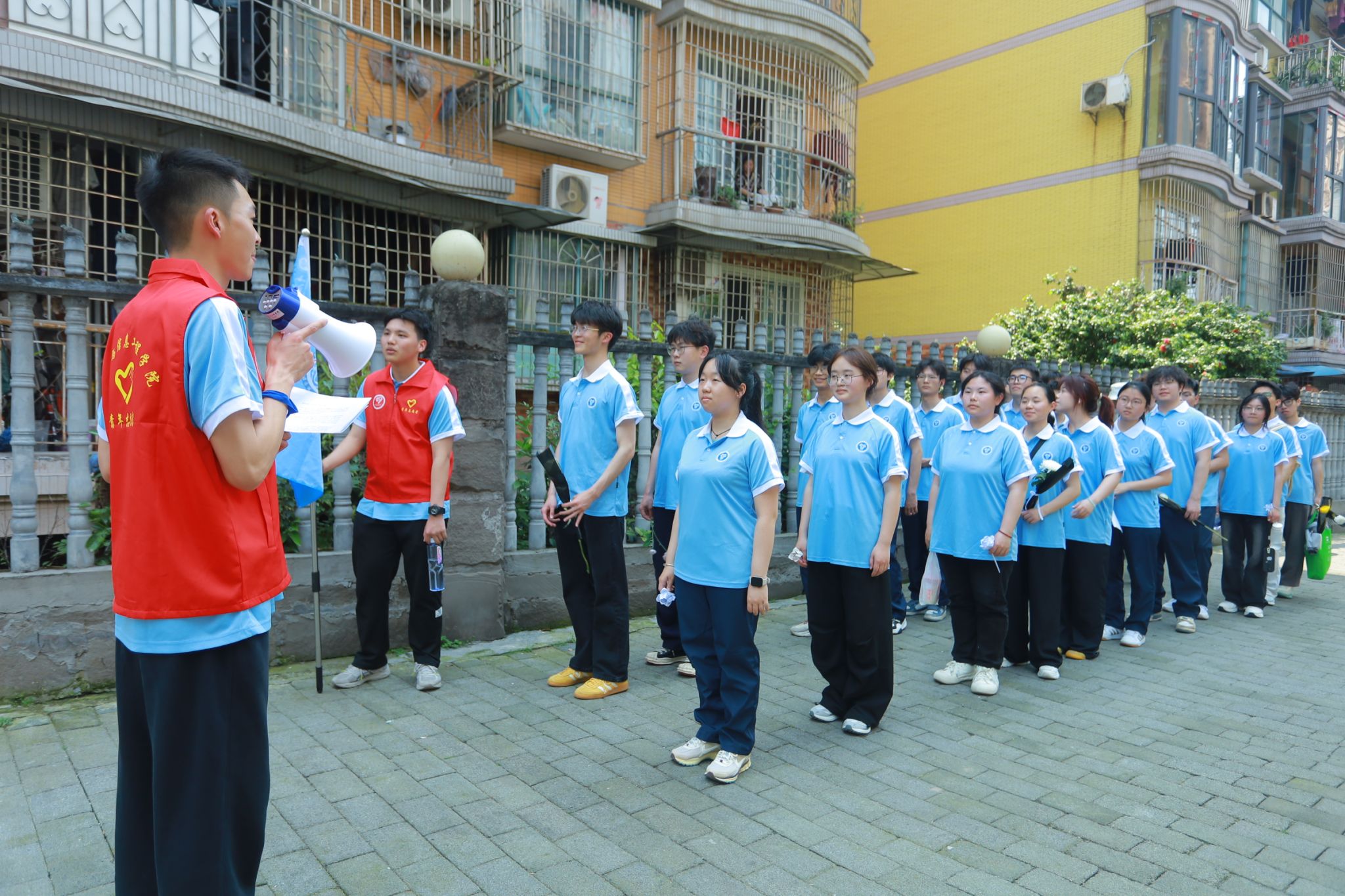 来回7.8公里的徒步,通信学子用双脚丈量着这片土地,向着人民公园革命烈士纪念碑坚定前行。合川人民公园革命烈士纪念碑位于重庆市合川区城北钓鱼城街道蟠龙山上的人民公园最高处。该碑于1993年7月动工修建,1994年4月竣工,是为纪念1926年中国共产党合川地方党组织成立以来,在合川牺牲的近千名革命烈士而修建。行进途中,“党青之光”理论宣讲志愿服务专项支队支队成员周锦松生动讲述合川地区的革命历史与英雄事迹,将红军长征的艰辛历程与当下的红色精神传承紧密结合。主持人王雨乐在新华小学门前引导全体成员精神昂扬,齐声高唱《强军战歌》,嘹亮的歌声回荡在行进路上,展现出新时代青年的蓬勃朝气。