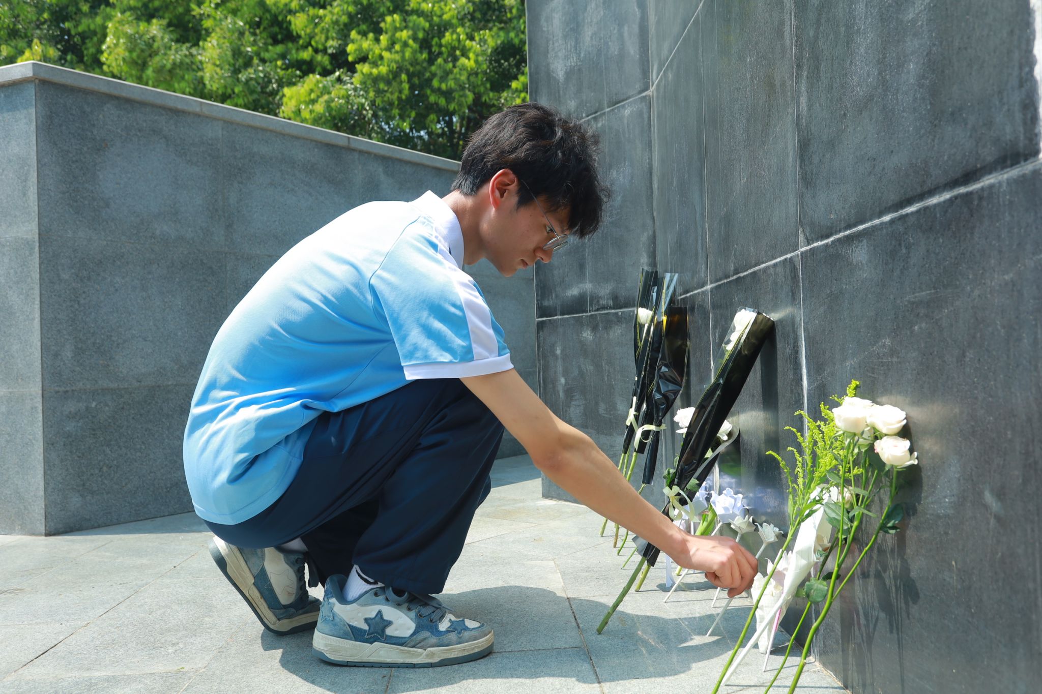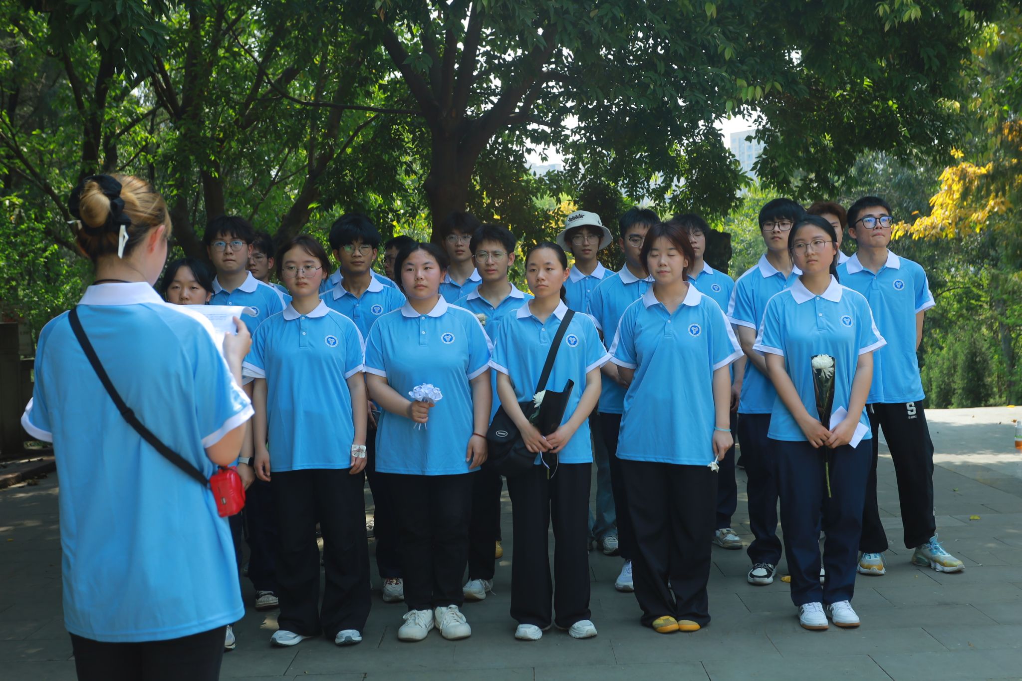 站立在合川人民公园革命烈士纪念碑前,活动进入庄严肃穆的缅怀追忆环节。周锦松同学以"合川革命斗争史"为主题展开宣讲,通过前期对相关史料的调查了解,周同学系统讲述了自1926年中共合川党组织成立以来革命先烈的斗争历程。当讲述到农会干部为掩护群众转移壮烈牺牲时,现场学子不约而同屏息凝视,手中的花攥出深深折痕。随着肃立默哀结束,24名学生代表依次缓步上前,将手中白菊轻放碑前。最后,全体成员鞠躬致敬,以无声的缅怀表达对英雄的深切追思。