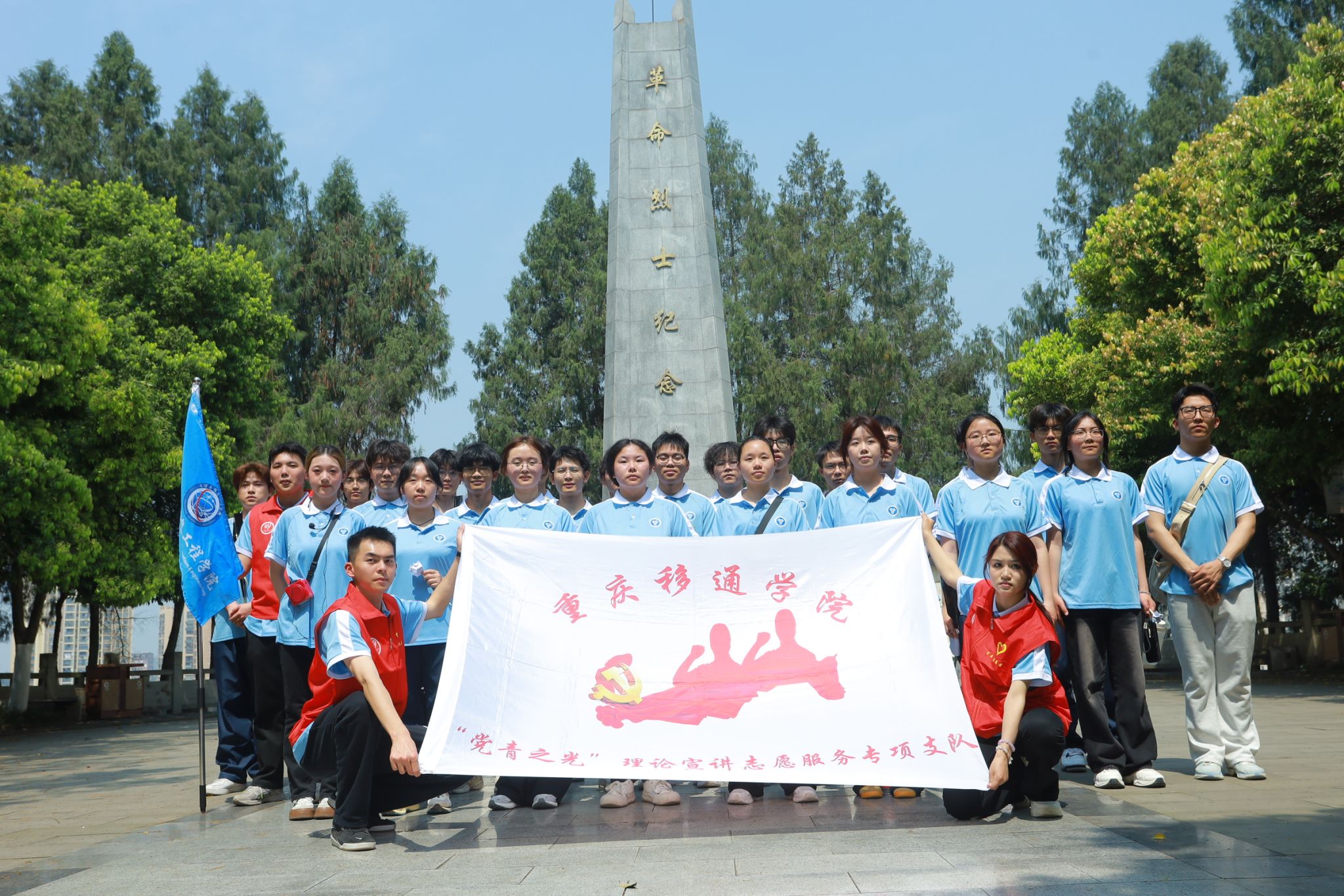 一寸山河一寸血,一抔热土一抔魂。为深入了解重庆合川本地的红色历史,悼念革命烈士,缅怀先烈的丰功伟绩,激发学子的爱国情怀,由重庆移通学院通信与信息工程学院青年志愿者协会主办,重庆移通学院通信与信息工程学院青年志愿者协会承办,“党青之光”理论宣讲志愿服务专项支队、2024级通信工程03支部协办的“青春足迹,红色传承"行走的思政课堂活动于2025年4月9日13:00在合川人民公园人民纪念碑庄严开展。