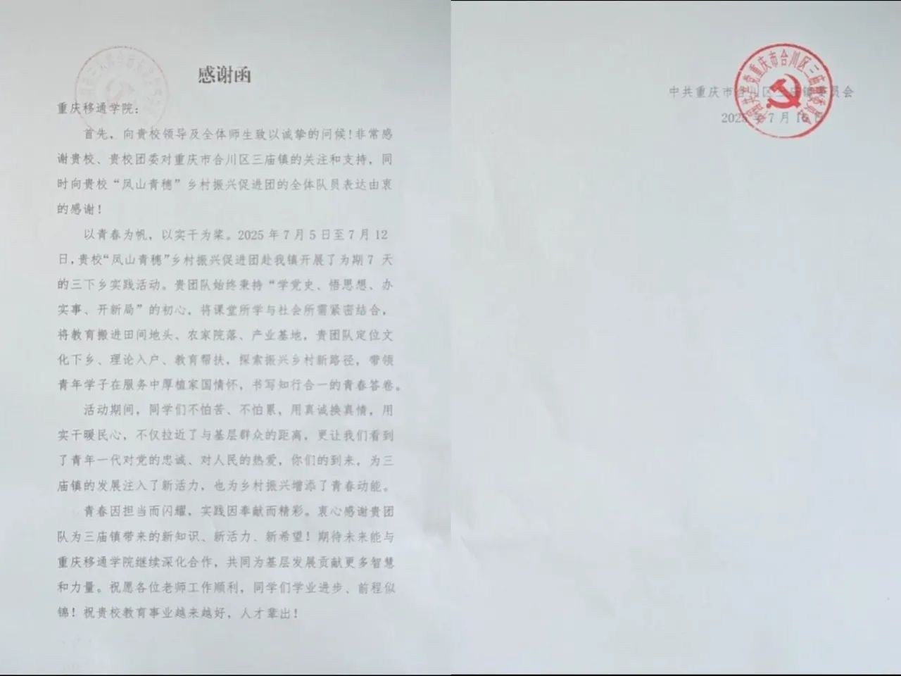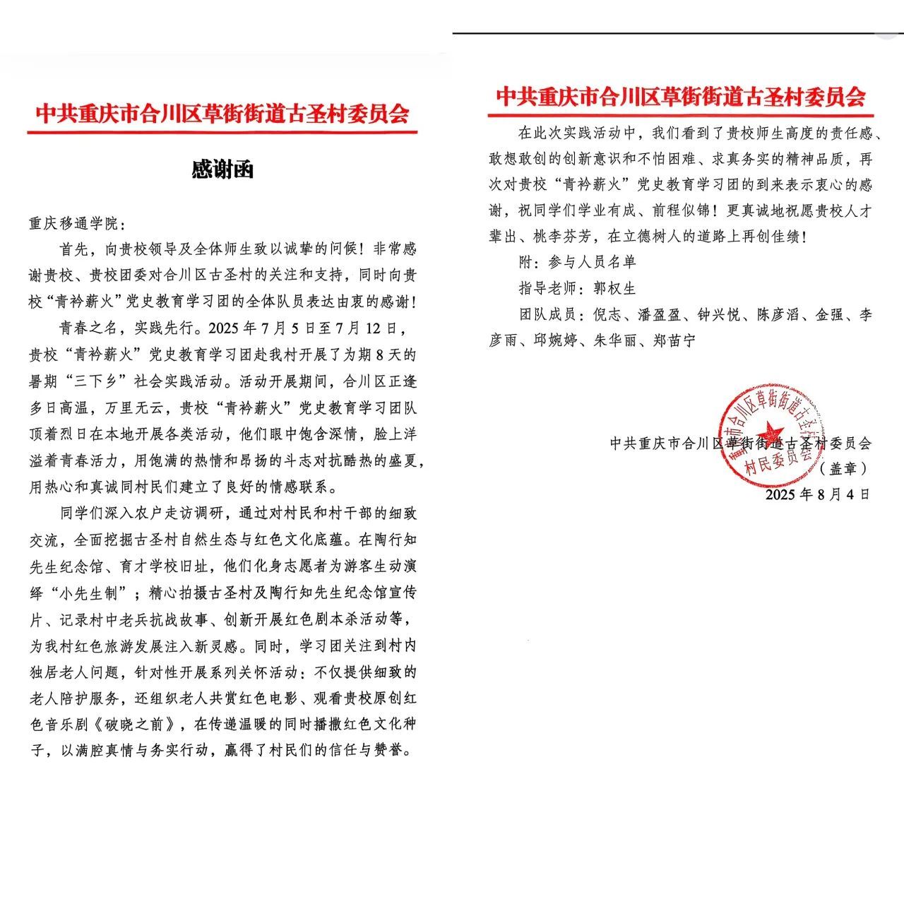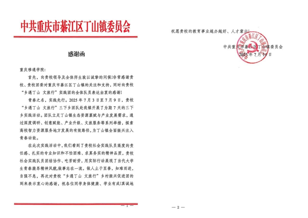 团队在重庆涪陵蔺市街道泡桐村开展7天实践:从市场调研、入户走访到专题讲座、助农直播,全方位参与乡村发展,落地“最青春”微团课实践基地,助力解锁“泡桐好味道”产业密码、推动村集体公司运营。16名队员秉持“一个都不能少”的协作精神,因实体锦旗制作周期冲突,先收电子版锦旗,约定9月回访敬赠、明年“再续新篇”。中共泡桐村支部委员会发表扬信,赞其“推动村集体公司与品牌建设迈上新台阶”。