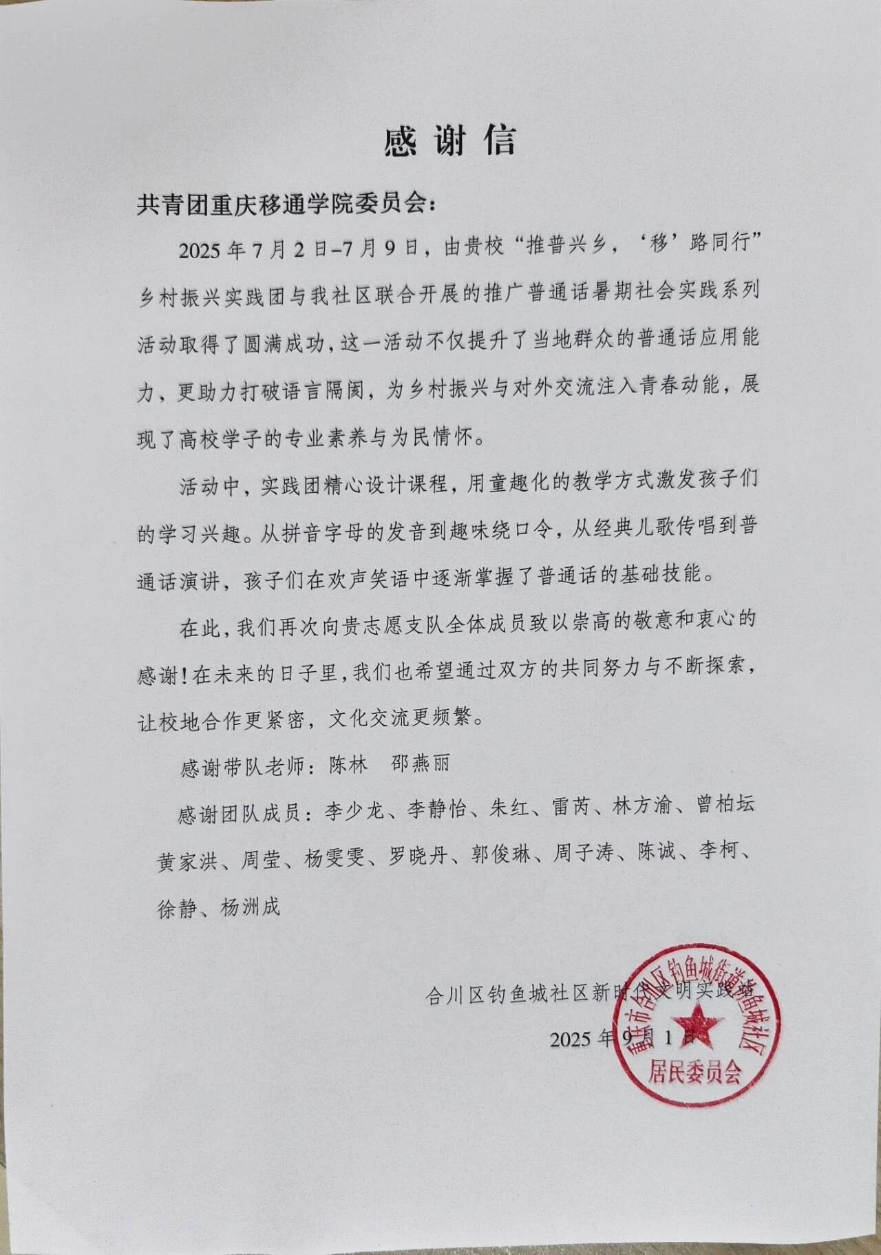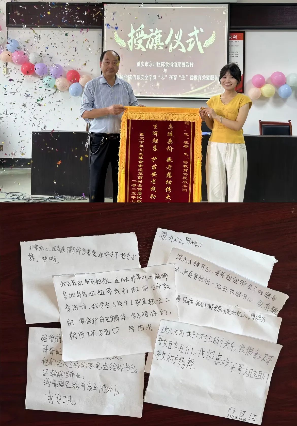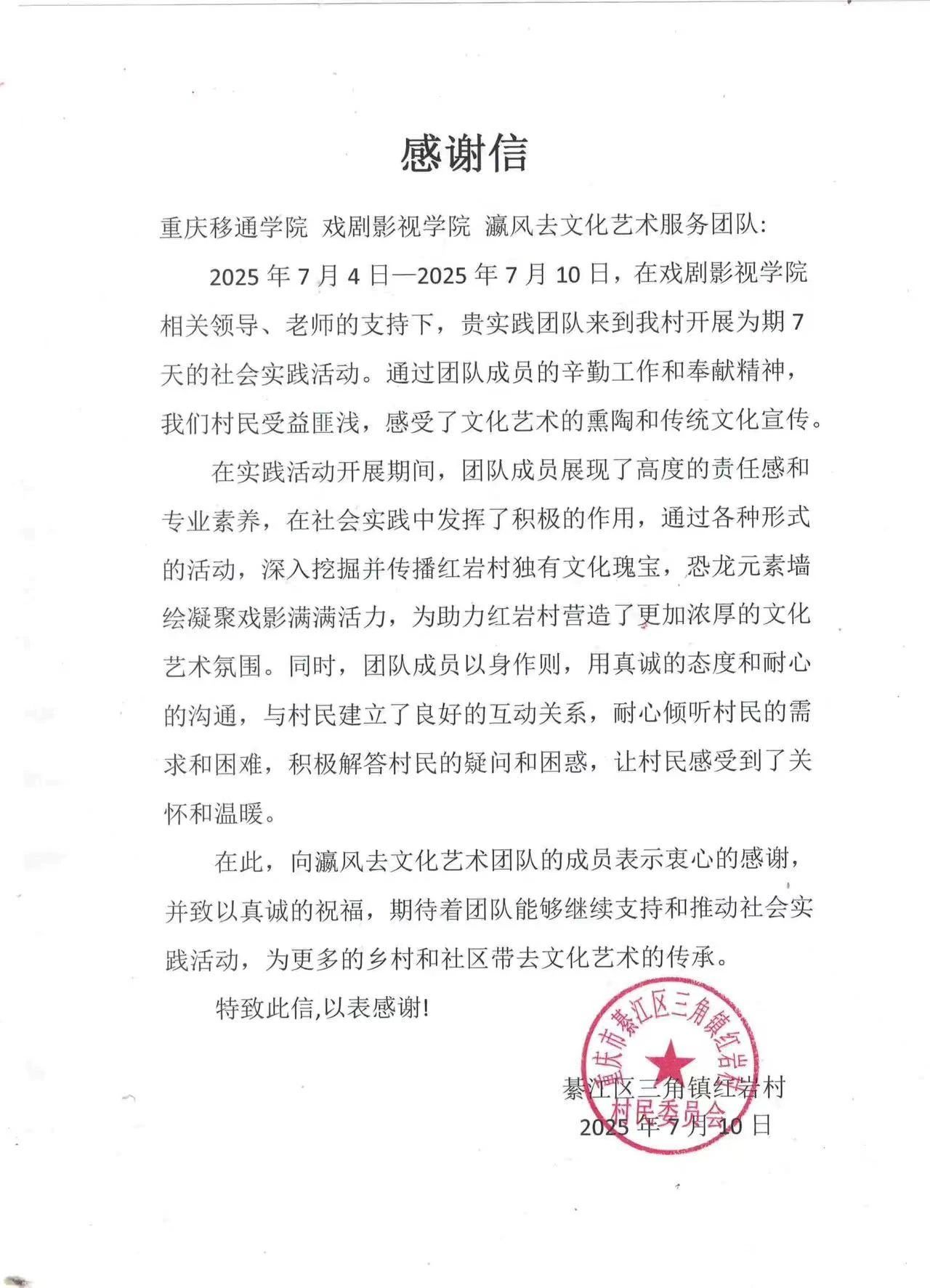 团队在重庆涪陵蔺市街道泡桐村开展7天实践:从市场调研、入户走访到专题讲座、助农直播,全方位参与乡村发展,落地“最青春”微团课实践基地,助力解锁“泡桐好味道”产业密码、推动村集体公司运营。16名队员秉持“一个都不能少”的协作精神,因实体锦旗制作周期冲突,先收电子版锦旗,约定9月回访敬赠、明年“再续新篇”。中共泡桐村支部委员会发表扬信,赞其“推动村集体公司与品牌建设迈上新台阶”。