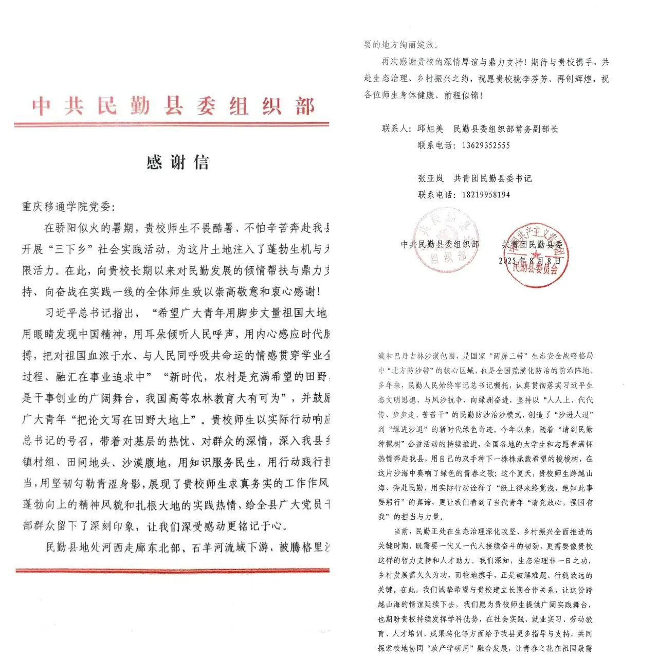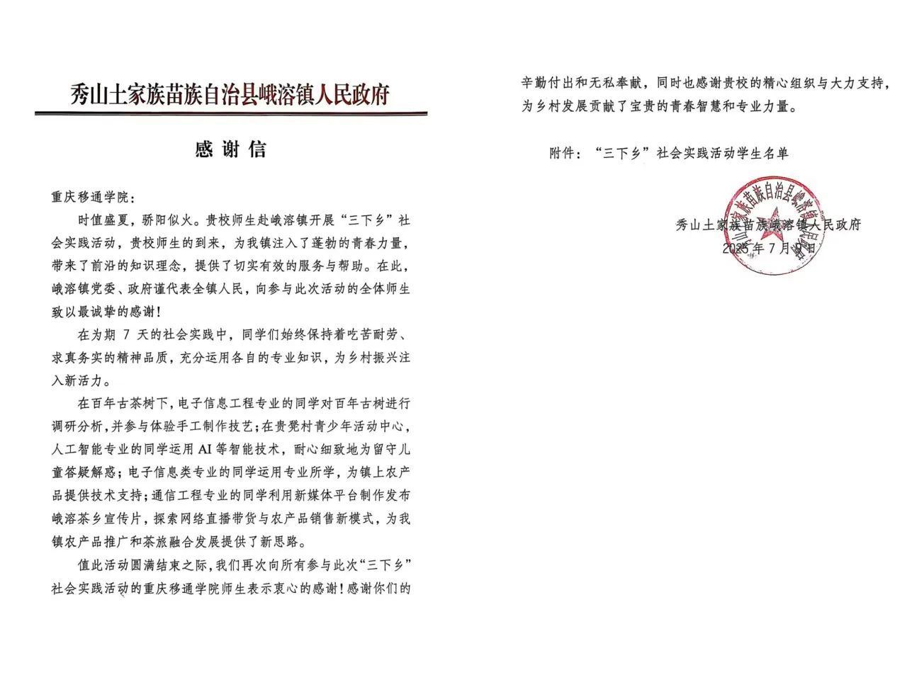 “三下乡”队员们将青春足迹深印在民勤的治沙路上、重庆的乡野巷弄间:他们以耐心助老,以温暖育人,以创新助农。点滴奉献不仅换来了真情涌动的感谢信,更让“扎根基层”的信念种子深植心田。师生们以专业赋能乡村,从推普兴乡到文化振兴,从红色传承到产业开拓,切实破解发展难题,也在实干中收获成长。政府的致谢、村民的点赞、媒体的报道,每一份认可都见证着“青年与乡村”的双向奔赴,让这场青春实践充满温度与回响。