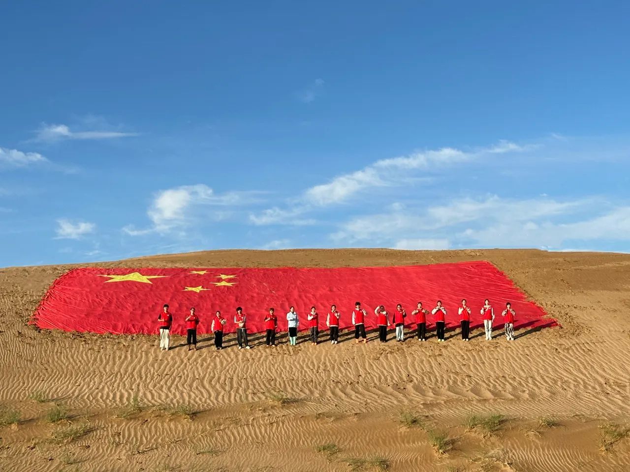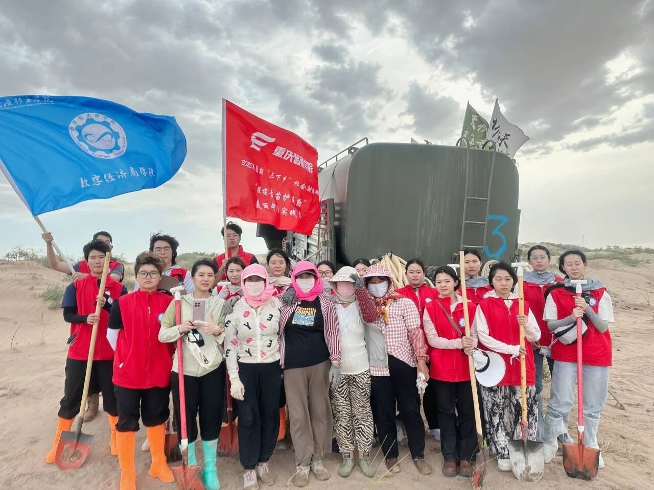7月4日至12日,17名师生赴甘肃民勤治沙:顶风沙为梭梭苗浇水回填,借新媒体开“云端治沙直播”呈治沙艰辛,“助农直播”半小时销超900单、销售额2.1万余元,还开线上环保课堂吸引2000多人学习,85篇报道(覆盖“中华网”“人民日报”等30余个平台),总浏览超5万次,多篇稿件入选《志愿青年学刊》。“在民勤,每滴汗让我们懂坚守:治沙人糙手、三代护绿洲故事、沙漠国旗,都诉‘沙退绿进’非口号。”