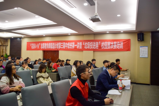 2018年10月24日晚上19点,“花果4+N”志愿者先锋锻造计划第三期中级班第一讲暨“‘垃圾投进趣’全国青年公益实践大赛”决赛培训会于行政楼A601举行。此次活动邀请到了李麒麟老师担任本次培训会主讲,为花果培训计划中级班的学员们讲解并培训有关于项目策划,项目包装,项目实施等内容,并以正在我校激烈开展的“垃圾投进趣”比赛为实例,为大家进行赛前培训。