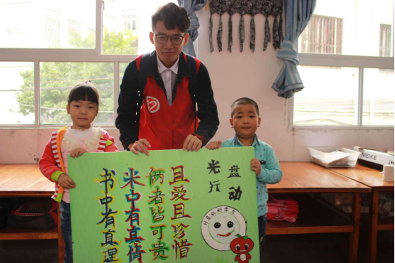 小朋友们都自发地决定回家后给自己的爸爸妈妈、小伙伴们宣传光盘行动,让他们也一起参与到光盘行动的行列中来。接着我们带领每位小朋友吟诵《悯农》:“锄禾日当午,汗滴禾下土。谁知盘中餐,粒粒皆辛苦。”小朋友用心说出的每一个字至今还在我的耳边的环绕。在活动最后,我们和小朋友们一起玩一个叫逛三园的小游戏,小朋友们争相举手,可奈何时间有限没有让每一位小朋友都玩一次小游戏。