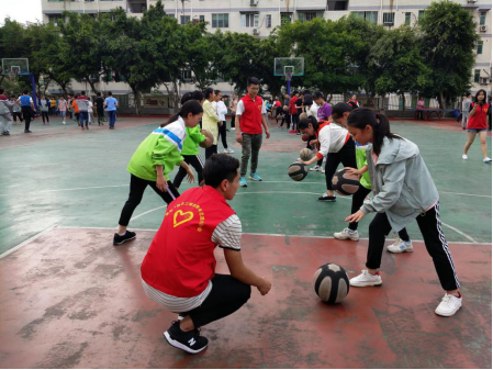 2017年5月,志愿者们在操场上和小朋友一起运动。陪伴他们在课余时光放松心情,锻炼身体,同时发展兴趣爱好。