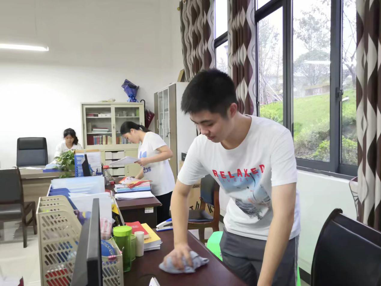 其二,通过对教师办公室的打扫整理,营造干净整洁的办公环境。同学们用自己带来的劳动工具,井井有条地忙碌在外语系的办公室内。经过一番汗水的挥洒,积极的配合,将老师的办公桌擦拭地干干净净,污渍处也清理到位。