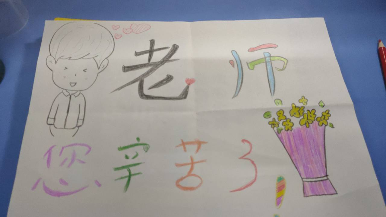 此次教师节特别活动,其意在于给老师们准备惊喜。通过前期的交流探讨,决定从三个方面入手。其一,准备手绘贺卡,传达祝福。即使同学们有着不成熟的画技,但依然忽视不了他们的用心。醒目的“老师您辛苦了”,简单话语里,是同学们满溢的感激之情。