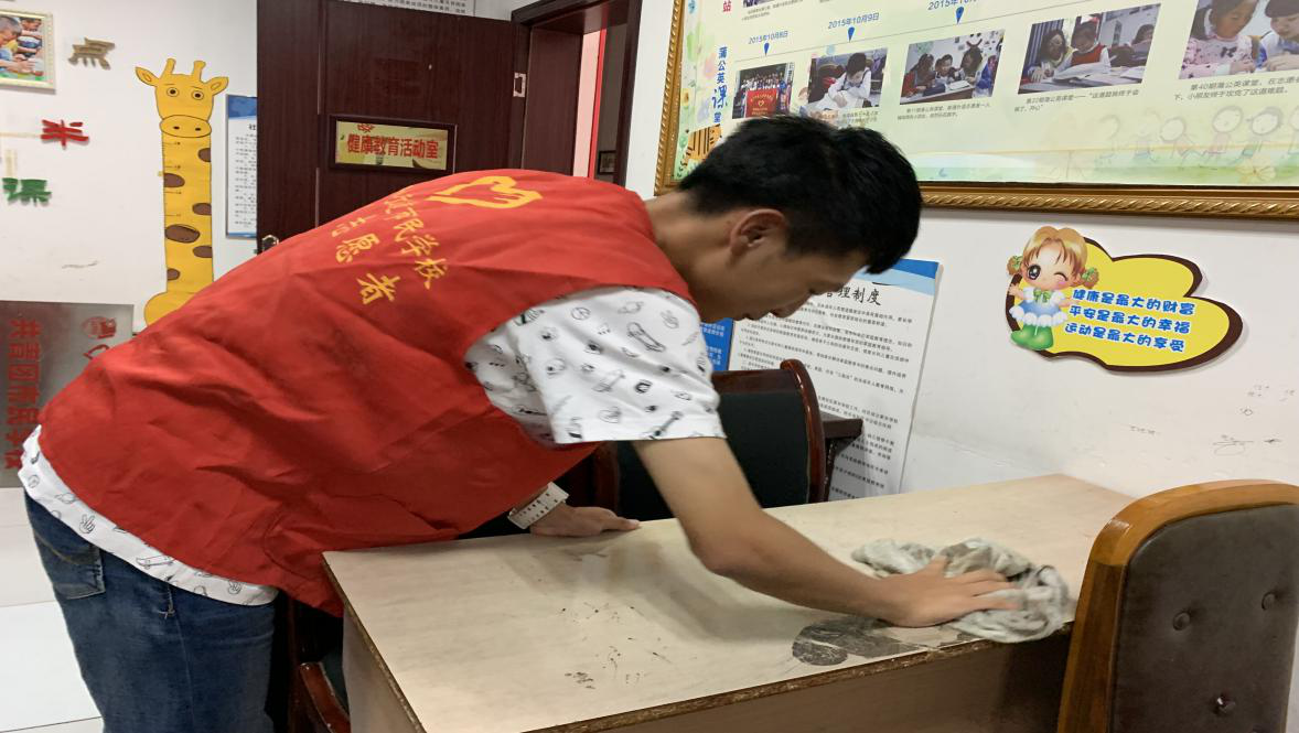 秋风送走了炎热的夏天,带来了一丝丝凉爽,志愿者们在校门口集合完毕后,一起来到了濮湖社区。走进社区,志愿者们抑制不住激动的心,在小朋友还没到来之时,早已开始“未雨绸缪”。拿上扫帚,抹布,拖把等清洁工具,为小朋友们营造一个整洁的学习环境。