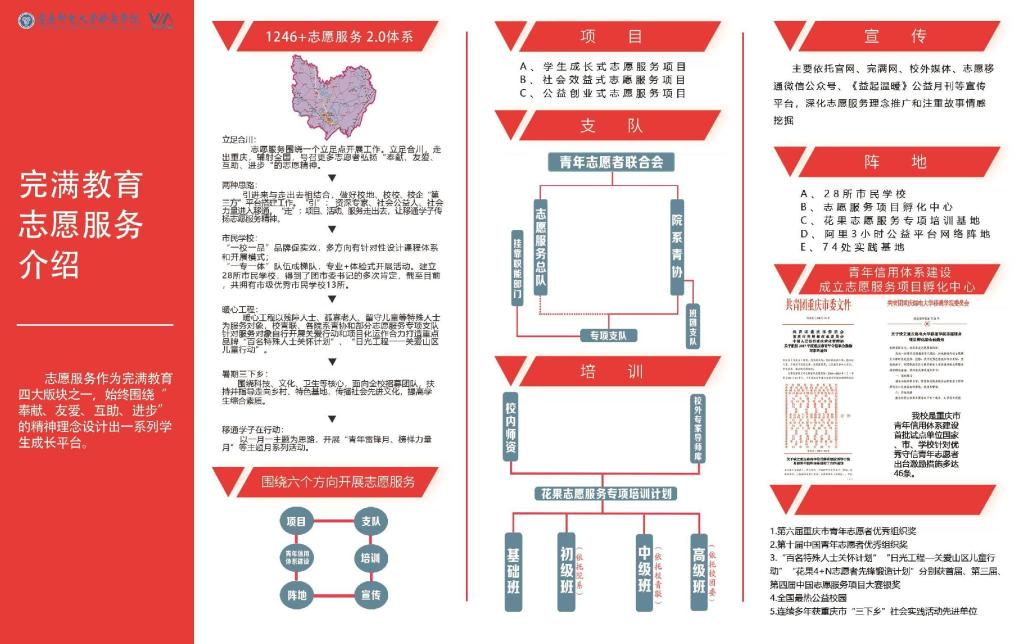 志愿服务作为学校完满教育四大版块之一,是我校培养人才的重要平台。6年来,从“阵地化-常态化-品牌化-全民化-项目化-专业化”历程一步一脚印的探索,在总结沉淀中对志愿服务体系进行重构,优化实践育人体系,构建了“立足合川,将大学本土化,走出去、引进来两种形式将大学开放化,市民学校、暖心工程、移通学子在行动、暑期三下乡社会实践活动四条主线和支队、项目、培训、宣传、阵地、青年信用体系建设六个方向将志愿服务多元化”的“1246+”志愿服务2.0体系,实现了志愿服务与实践育人的无缝对接,进一步扩大志愿服务育人效果。