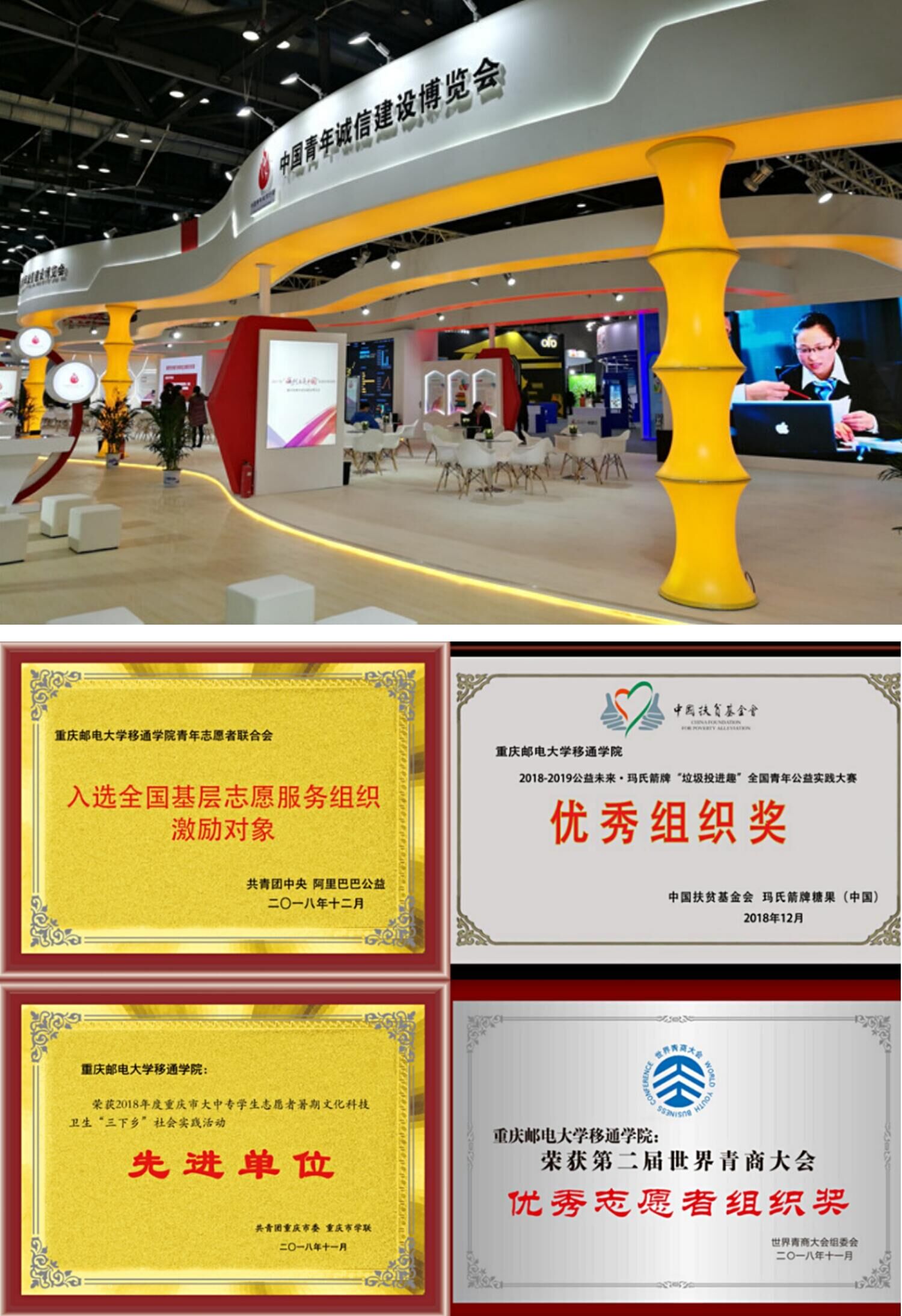 荣获第二届全国“最热公益校园”荣誉称号、中国青年志愿者优秀组织奖,“百名特殊人士关怀计划”“日光工程”关爱山区儿童行动分别荣获首届、第三届中国青年志愿服务项目大赛银奖,“花果”志愿服务培训计划荣获第四届中国青年志愿服务项目大赛银奖。涌现出中国大学生自强之星王仁东、杨俊瑞,中国电信奖学金获得者叶思路等全国志愿服务先进典型。并且受邀参加2019中国国际智能产业博览会、世界青商大会、中华龙舟公开赛等国内外大型赛会志愿服务工作,获得主办单位和参赛(会)嘉宾的好评。这些成绩的取得也体现出我校“商科教育+完满教育+通识教育+专业教育”四位一体育人模式取得的成果。