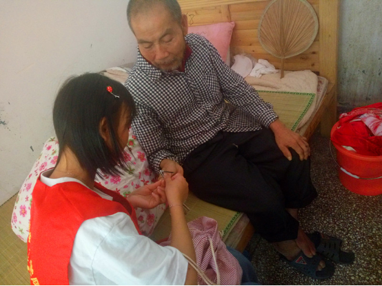 活动中,志愿者发现老人的指甲又长又厚,很久没有剪过了,在询问中得知,他以前买过指甲刀,但是由于记性不好经常丢三落四,就找不到了,有时候会借别人的剪刀去剪一下。志愿者决定给几位老人一起剪指甲。活动后期,志愿者细心叮嘱老人要按时吃饭照顾好自己身体,劝解抽烟的老人少抽烟,大家的眼神中都充满了心疼和不舍。
