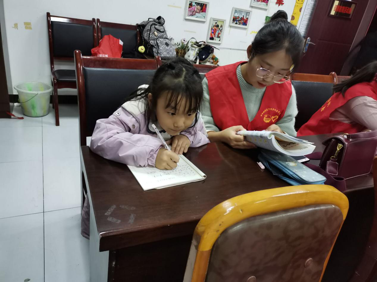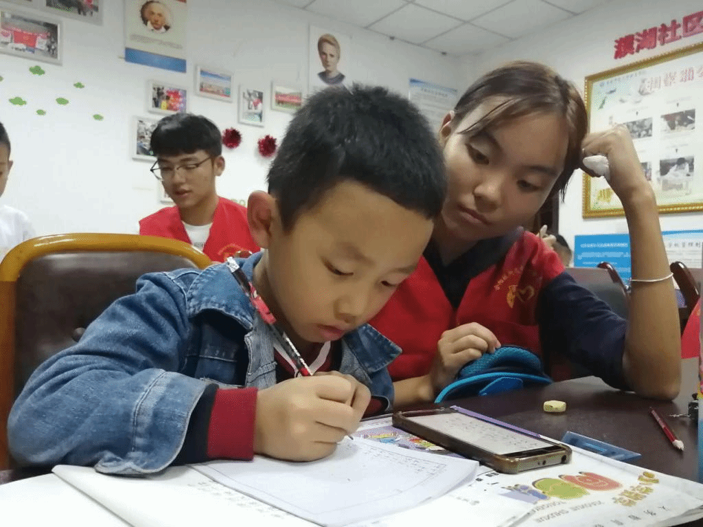 在社区门口,有两位志愿者静静地等待着小朋友的到来。十几分钟后,小朋友们一个接一个的跑来,志愿者很热心的帮他们提书包、带领他们到教室里坐好位置。虽然作为新一届的志愿者内心还是稍带紧张,但是经过前几次活动的相处中,志愿者们与小朋友们已经慢慢熟悉起来。小朋友们安静地做题,出现不会的情况,他们很积极的向志愿者求助,志愿者也十分耐心的给他们讲解,直到他们听懂并自己会做为止。在志愿者们认真打扫的教室里,志愿者和小朋友一起度过了近两个小时的欢乐时光,志愿者们给孩子们辅导功课,拍照留念,整个过程相处得甚是融洽。最后在课程结束之时,小朋友们开始收拾自己的作业和文具。在即将走出教室时,小朋友们还跑回来给辅导他们作业的哥哥姐姐说再见。看着他们脸上洋溢着灿烂的笑容,犹如冬日里的一缕阳光照射在我们脸上,温暖着我们的心。