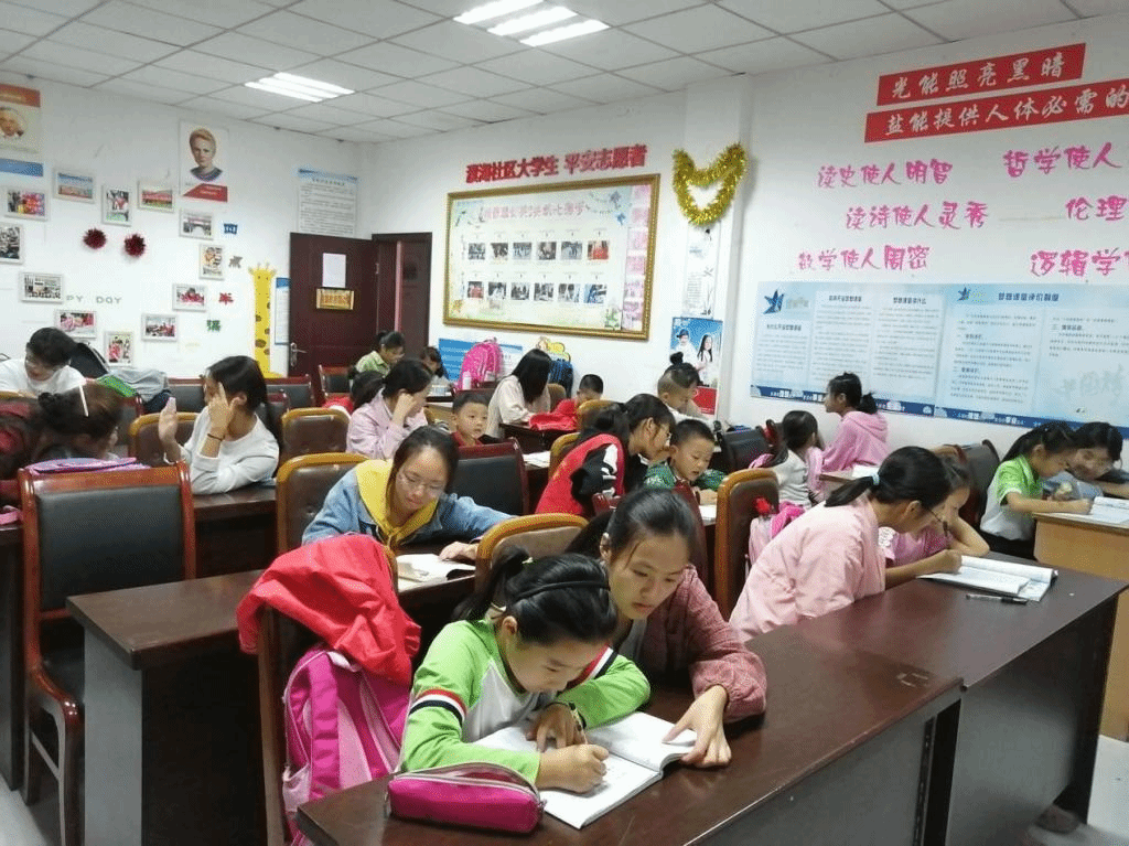 到达社区后,志愿者们与社区管理员确认好活动时间和相关事宜后,便开始打扫卫生—抹桌子、拖地、将桌子排列整齐、把书柜里的书籍摆放好,争取给小朋友们提供一个舒适的学习环境,并将凳子搬在教室外以便家长在等小朋友下课期间可以稍作休息。随后,每一位志愿者都穿上了志愿者服装,并将手机调制为振动放在桌子底下。他们的脸上呈现着期待的神情,在教室里耐心的等待着小朋友的到来。