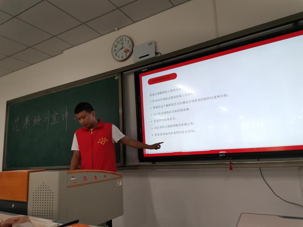 志愿服务具有崇高的精神价值,巨大的社会价值。为响应社会需求,加强智能工程学院2019级班团对志愿服务的认识,提高对志愿服务的积极性,2019年10月17日中午,智能工程学院青年志愿者协会于竹逸书院A101对车辆工程二、三班开展了 “花果”初级班实践培训会。