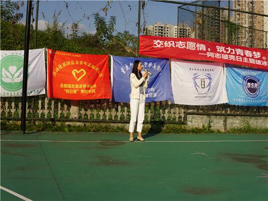 在由青协和支队成员共同组成的裁判团和工作人员准备就绪后,破冰活动正式开始。主持人简短的开场白后,邀请到张颖超老师为本次破冰活动致辞。张颖超老师站在八面支队队旗和一面青协会旗前,为志愿者们依次介绍了每面旗子的来历和背后的故事,并欢迎在场的所有人加入志愿者这个大家庭,对今后一年的工作寄予了厚望。