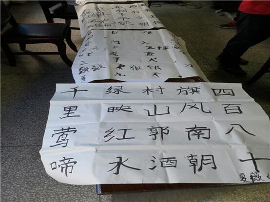 紧接着就是由书法社团的成员向小朋友们展示书法写作时间,他们向小朋友细心传授握笔的姿势,并一笔一划地在宣纸上书写。小朋友们跃跃欲试,都迫不及待地想要亲自体验,她们按照书法社成员的讲解,在宣纸上写下了一个又一个毛笔字,这些毛笔字连成一句又一句诗,让整个教室都充满着学习的气息。