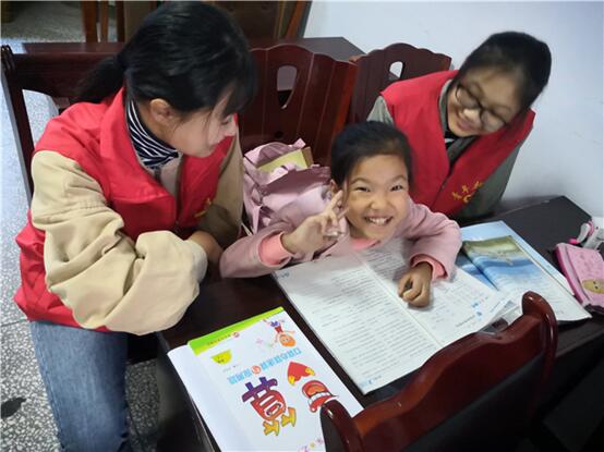 一进活动教室,志愿者们就被小朋友的热情所打动,于是她们活跃成一片,在欢声笑语中快乐地学习。不问来处,她们仅仅用她们的笑容感染每一位志愿者。志愿者用心观察着小朋友做着作业,当小朋友遇到困难时,他们便细心教他们如何解决难题,告诉他们正确解题的方法。当然,志愿者也会检查他们已经做完的作业,从中找出错误让他们修改,志愿者跟小朋友打成一片,不一会儿的时间,她们便有说有笑,乐在其中。