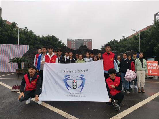 为了传递交通文明知识,提高合川市民和重庆邮电大学移通学院学生的“文明出行,安全出行”,2019年10月26日上午八点三十分,智能工程学院“知交规·行安全 ”支队的志愿者们穿上红马甲在学校大门口集合并拍照留念。