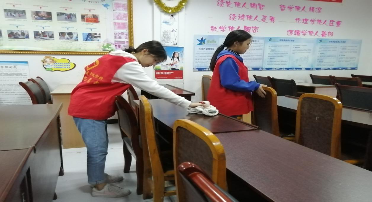 为了营造一个良好的学习环境,在小朋友们到来之前志愿者们将教室打扫干净。打扫完后志愿者们在门口迎接小朋友的到来,小朋友们见到志愿者后亲切的打着招呼,在志愿者的带领下坐到相应的座位上,拿出自己的作业,青年志愿者也怀揣着高涨的热情和耐心为小朋友们解难答惑。