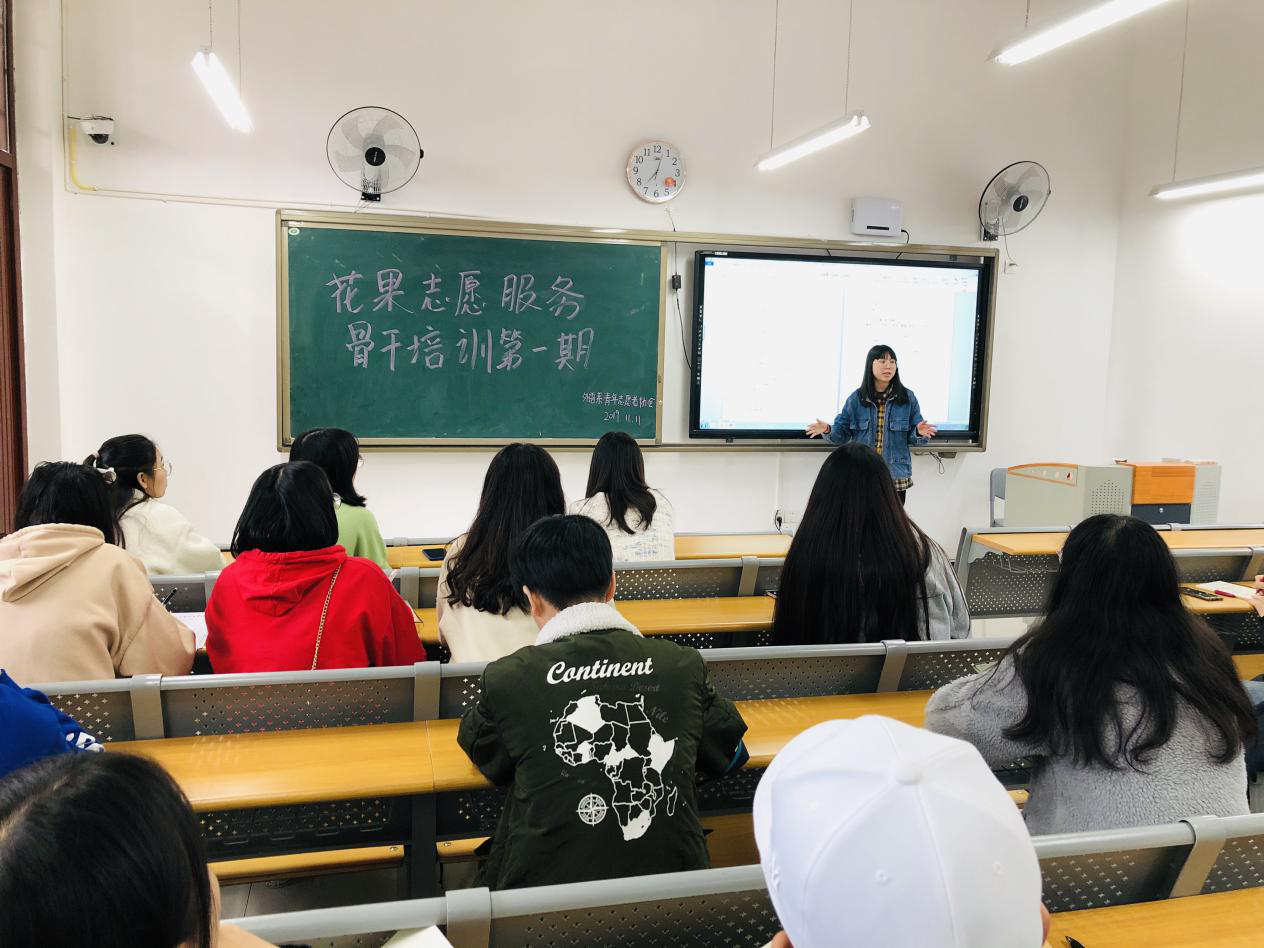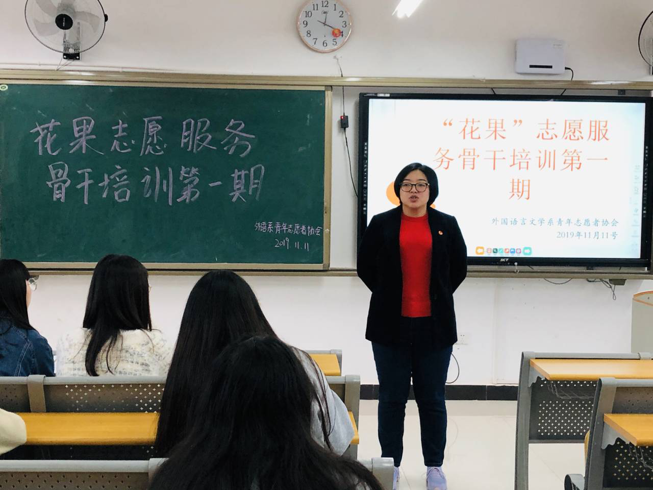2019年11月11日,为了让外语系各位班团支队长深入了解志愿服务的意义以及如何建设班团志愿活动。在天渠105开展了第一期“花果”志愿骨干培训。同时还邀请到了纪老师为大家详细解读班团志愿活动。