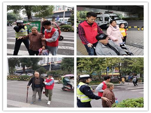 在站岗初期,交巡警们也不忘记对志愿者们细心指导,志愿者们也是认真聆听。在交谈间无不体现出交巡警和志愿者对人们能安全出行的共同期望。志愿者们热心帮扶行动缓慢的老人前行,老人们也感受到志愿者热情服务,纷纷点赞。见提着重物的人们志愿者都努力为行人分担这份重量,斑马路两旁定期都有志愿者身影,小小的动作,不是感人,而是感染人,一传十,十传百......交规的讲解传递效果更佳,创建和谐社会更近一步。