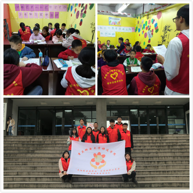 "太阳花亲情驿站"关爱双职工子女志愿服务专项支队在2015年9月正式成立,团队由黄秋莹等数十人组成,充分发挥自身的带头作用,坚持奉献、友爱、互助、进步的志愿服务精神。此支队是以帮助双职工子女为目的的志愿服务支队,该支队对负责的班级以足够的耐心、信心、责任心进行教学,让支队的“奉献、友爱、互助、进步”的青年志愿者精神深入人心,更加充溢社会。通过对不同阶段的学生进行课后学习辅导,帮助其更好的学习、进步和成长。此外,还会为小朋友们提供课外学习的机会,培养他们的兴趣爱好,丰富他们的知识,也让双职工子女感受到社会大家庭的温暖。支队成立至今,共开展302期活动,累计服务人数达4859人次。