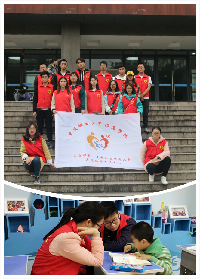 “e+1”四点半课堂关爱城区留守儿童志愿服务专项支队成立于2017年9月,是大数据与软件学院所属支队之一,以“爱心献社会,真情暖人心”为宗旨,坚持“自愿、无偿、平等、诚信、合法”的原则,深入开展具有重庆邮电大学移通学院大学生志愿服务特色的公益活动。活动开展共计129期,活动参与达2384人(其中体验式支队员参与活动达270人),受益人数达1935人。每周三,周五,周日下午在杨柳街和草花街分别开展活动,正常上课期间,由“e+1”四点半课堂支队干事带领着班级志愿者在草花街和杨柳街替留守儿童辅导功课促使他们努力学习,并且能够高效地学习,帮助留守儿童解答生活中的一些难题打开他们的心扉。在周末会开设一些兴趣课堂,通过折纸,绘画等小课堂来打开孩子们的心扉,帮助其培养兴趣爱好。