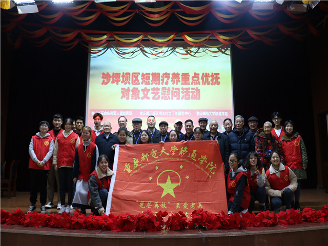 2019年11月23日,重庆邮电大学移通淬炼商学院的青年志愿者协会联合鸿杰社工、淬炼商学院vens艺术团于重庆市革命伤残军人康复医院为短期疗养的军人们举行慰问演出活动。